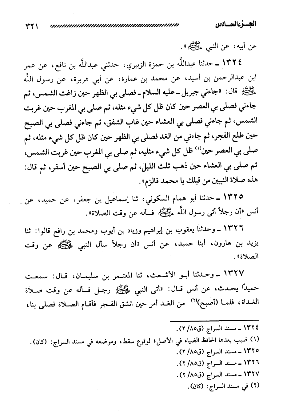 1326- وَحَدَّثَنَا يَعْقُوبُ بْنُ إِبْرَاهِيمَ وَزِيَادُ بْنُ أَيُّوبَ وَمُحَمَّدُ بْنُ رَافِعٍ قَالُوا: ثنا يَزِيدُ بْنُ هارون، أبنا حُمَيْدٌ، عَنْ أَنَسٍ ((أَنَّ رَجُلا سَأَلَ النَّبِيَّ صَلَّى اللَّهُ عَلَيْهِ وَسَلَّمَ عَنْ وَقْتِ الصَّلاةِ)) .
