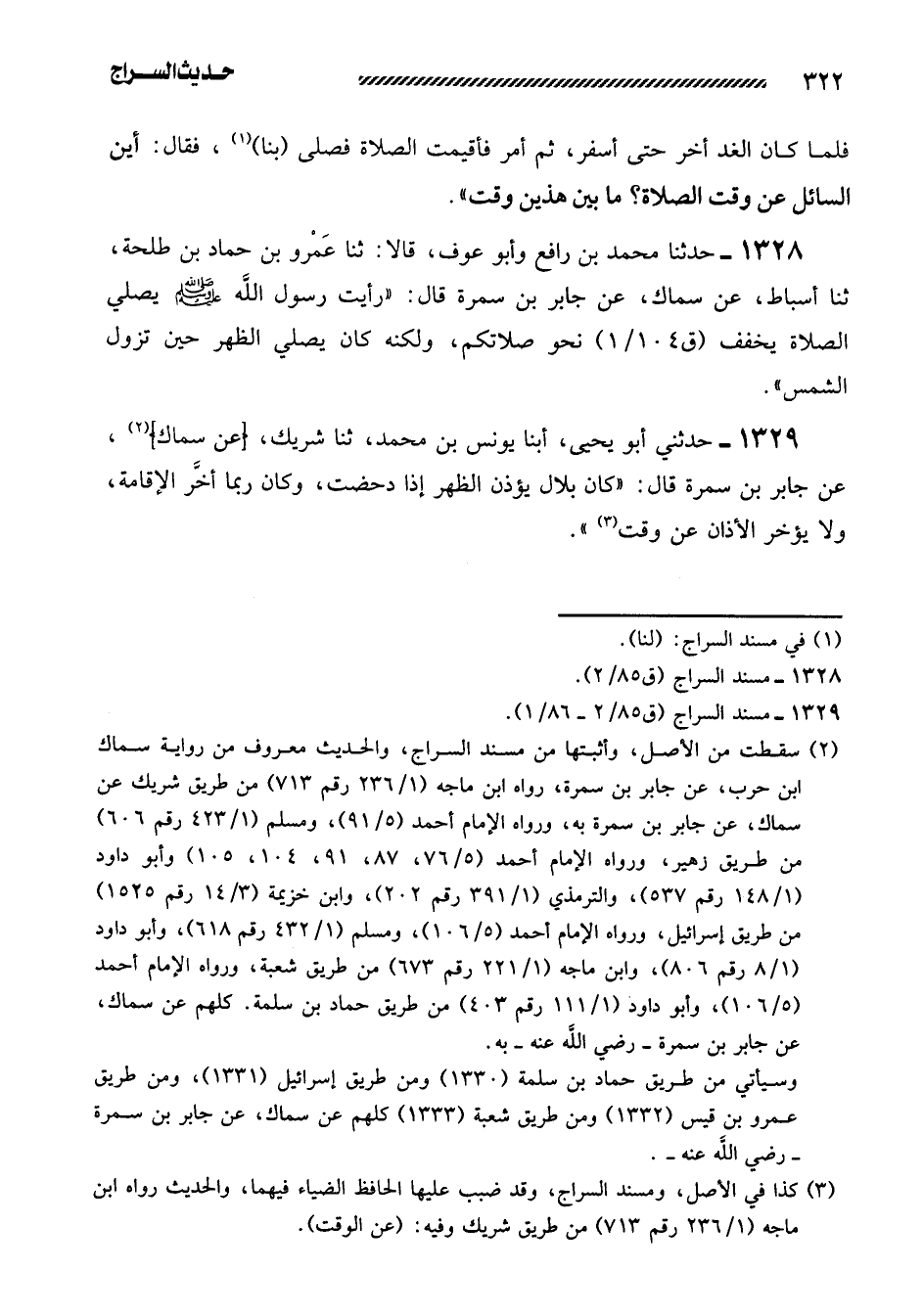 1328- حَدَّثَنَا مُحَمَّدُ بْنُ رَافِعٍ وَأَبُو عَوْفٍ، قَالا: ثنا عَمْرُو بْنُ حَمَّادِ بْنِ طَلْحَةَ، ثنا أَسْبَاطٌ، عَنْ سِمَاكٍ، عَنْ جَابِرِ بْنِ سَمُرَةَ قال: ((رأيت رسول الله صلى الله عليه وَسَلَّمَ يُصَلِّي الصَّلاةَ يُخَفِّفُ نَحْوَ صَلاتِكُمْ، وَلَكِنَّهُ كَانَ يُصَلِّي الظُّهْرَ حِينَ تَزُولُ الشَّمْسُ)) .