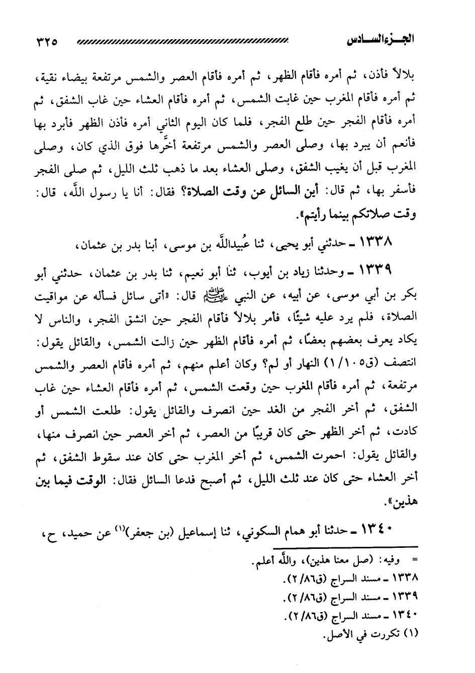 1339- وَحَدَّثَنَا زِيَادُ بْنُ أَيُّوبَ، ثنا أَبُو نُعَيْمٍ، ثنا بَدْرُ بْنُ عُثْمَانَ، حَدَّثَنِي أَبُو بَكْرِ بْنُ أَبِي مُوسَى، عَنْ أَبِيهِ، عَنِ النَّبِيِّ صَلَّى اللَّهُ عَلَيْهِ وَسَلَّمَ قَالَ: ((أَتَى سَائِلٌ فَسَأَلَهُ عَنْ مَوَاقِيتِ الصَّلاةِ، فَلَمْ يَرُدَّ عَلَيْهِ شَيْئًا، فَأَمَرَ بِلالا فَأَقَامَ الْفَجْرَ حِينَ انْشَقَّ الْفَجْرُ، وَالنَّاسُ لا يَكَادُ يَعْرِفُ بَعْضُهُمْ بَعْضًا، ثُمَّ أَمَرَهُ فَأَقَامَ الظُّهْرَ حِينَ زَالَتِ الشَّمْسُ، وَالْقَائِلُ يَقُولُ: انْتَصَفَ النَّهَارُ أو لم؟ وَكَانَ أَعْلَمُ مِنْهُمْ، ثُمَّ أَمَرَهُ فَأَقَامَ الْعَصْرُ وَالشَّمْسُ مُرْتَفِعَةٌ، ثُمَّ أَمَرَهُ فَأَقَامَ الْمَغْرِبَ حِينَ وَقَعَتِ الشَّمْسُ، ثُمَّ أَمَرَهُ فَأَقَامَ الْعِشَاءَ حِينَ غَابَ الشَّفَقُ، ثُمَّ أَخَّرَ الْفَجْرَ مِنَ الْغَدِ حِينَ انْصَرَفَ وَالْقَائِلُ يَقُولُ: طَلَعَتِ الشَّمْسُ أَوْ كَادَتْ، ثُمَّ أَخَّرَ الظُّهْرَ حَتَّى كَانَ قَرِيبًا مِنَ الْعَصْرِ، ثُمَّ أَخَّرَ الْعَصْرَ حِينَ انْصَرَفَ مِنْهَا، وَالْقَائِلُ يَقُولُ: احْمَرَّتِ الشَّمْسُ، ثُمَّ أَخَّرَ الْمَغْرِبَ حَتَّى كَانَ عِنْدَ سُقُوطِ الشَّفَقِ، ثُمَّ أَخَّرَ الْعِشَاءَ حَتَّى كَانَ عِنْدَ ثُلُثِ اللَّيْلِ، ثُمَّ أَصْبَحَ فَدَعَا السَّائِلَ فَقَالَ: الْوَقْتُ فِيمَا بين هذين)) .