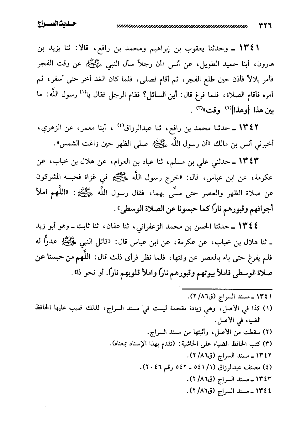 1344- حَدَّثَنَا الْحَسَنُ بْنُ مُحَمَّدٍ الزَّعْفَرَانِيُّ، ثنا عَفَّانُ، ثنا ثَابِتٌ -وَهُوَ أَبُو زَيْدٍ- ثنا هِلالُ بن خباب، عن عكرمة، عن ابن عباس قَالَ: ((قَاتَلَ النَّبِيُّ صَلَّى اللَّهُ عَلَيْهِ وَسَلَّمَ عدواً له فلم يفرغ حتى باء بِالْعَصْر عَنْ وَقْتِهَا، فَلَمَّا نَظَرَ فَرَأَى ذَلِكَ قَالَ: اللَّهُمَّ مَنْ حَبَسَنَا عَنْ صَلاةِ الْوُسْطَى فَامْلأْ بُيُوتَهُمْ وَقُبُورَهُمْ نَارًا وَامْلأْ قُلُوبَهُمْ نَارًا. أَوْ نَحْوَ ذَا)) .