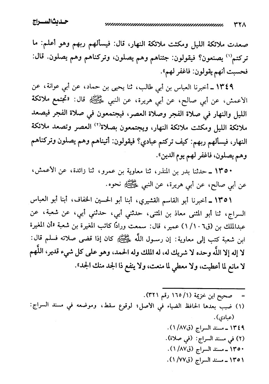 1351- أخبرنا أبو القاسم القشيري، أبنا أبو الحسين الخفاف، أبنا أَبُو الْعَبَّاسِ السَّرَّاجُ، ثنا أَبُو الْمُثَنَّى مُعَاذَ بن الْمُثَنَّى، حَدَّثَنِي أَبِي، حَدَّثَنِي أَبِي، عَنْ شُعْبَةَ، عَنْ عَبْدِ الْمَلِكِ بْنِ عُمَيْرٍ، قَالَ: سَمِعْتُ وَرَّادًا كَاتِبَ الْمُغِيرَةِ بْنِ شُعْبَةَ ((أَنَّ الْمُغِيرَةَ ابن شُعْبَةَ كَتَبَ إِلَى مُعَاوِيَةَ: أَنَّ رَسُولَ اللَّهِ صَلَّى اللَّهُ عَلَيْهِ وَسَلَّمَ كَانَ إِذَا قَضَى صَلاتَهُ فَسَلَّمَ قَالَ: لا إِلَهَ إِلا اللَّهُ وَحْدَهُ لا شَرِيكَ لَهُ، لَهُ الْمُلْكُ وَلَهُ الْحَمْدُ، وَهُوَ عَلَى كُلِّ شَيْءٍ قَدِيرٌ، اللَّهُمَّ لا مانع لما أعطيت، ولا معطي لما مَنَعْتَ، وَلا يَنْفَعُ ذَا الْجَدِّ مِنْكَ الْجَدُّ)) .