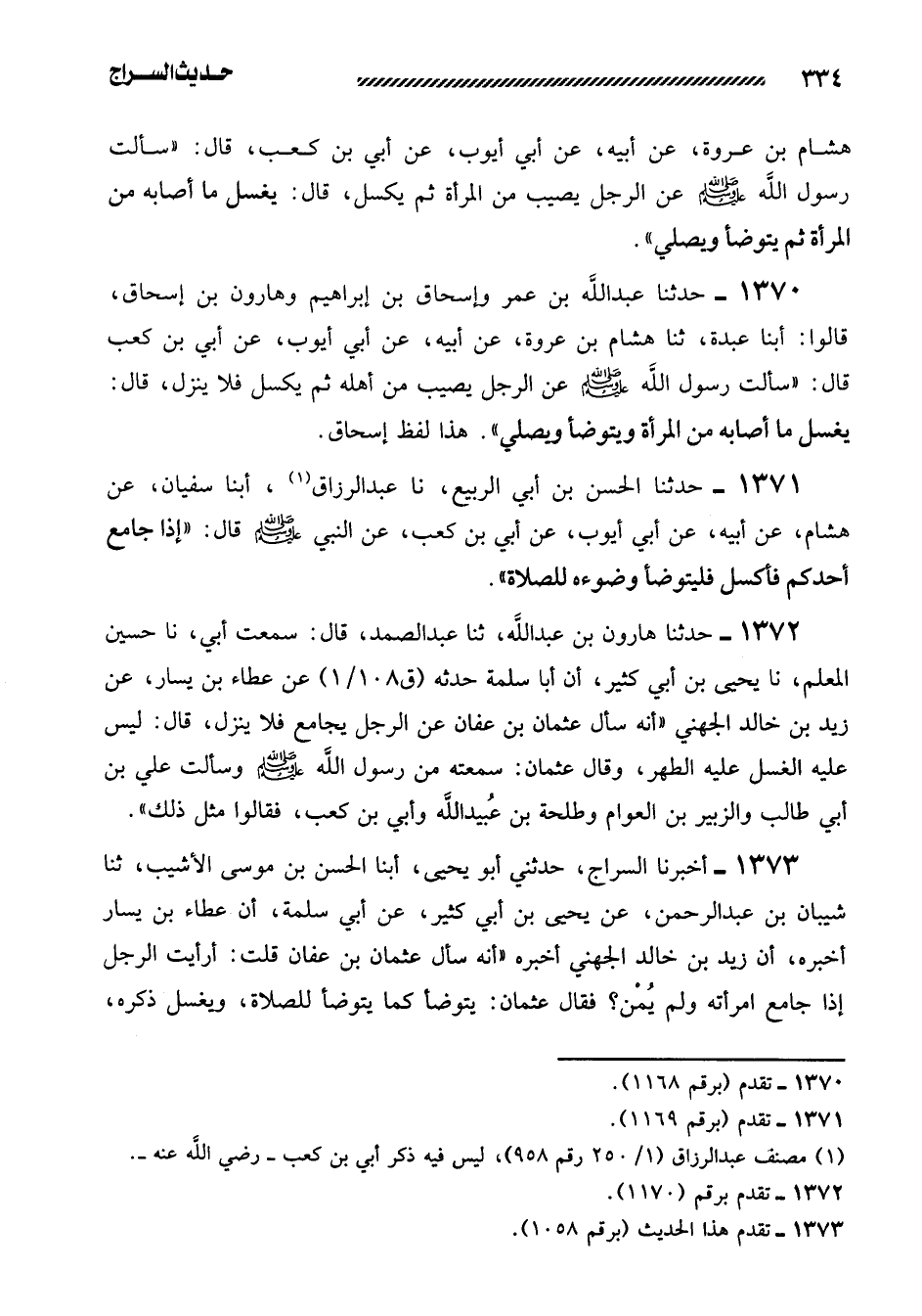 1373- أخبرنا السراج، حدثني أبو يحيى، أبنا الحسن بن موسى الأشيب، ثنا شيبان بن عَبْدِ الرَّحْمَنِ، عَنْ يَحْيَى بْنِ أَبِي كَثِيرٍ، عَنْ أَبِي سَلَمَةَ، أَنَّ عَطَاءَ بْنَ يَسَارٍ أَخْبَرَهُ، أَنَّ زَيْدَ بْنَ خَالِدٍ الْجُهَنِيَّ أَخْبَرَهُ ((أَنَّهُ سَأَلَ عُثْمَانَ بْنَ عَفَّانَ قُلْتُ: أَرَأَيْتَ الرَّجُلَ إِذَا جَامَعَ امْرَأَتَهُ وَلَمْ يُمْنِ؟ فَقَالَ عُثْمَانُ، يَتَوَضَّأُ كَمَا يَتَوَضَّأُ لِلصَّلاةِ، وَيَغْسِلُ ذَكَرَهُ، -[335]- قَالَ عُثْمَانُ: سَمِعْتُهُ مِنْ رَسُولِ اللَّهِ صَلَّى اللَّهُ عَلَيْهِ وَسَلَّمَ. فَسَأَلْتُ عَنْ ذَلِكَ عَلِيَّ بن أبي طالب وطلحة بين عُبَيْدِ اللَّهِ وَالزُّبَيْرَ بْنَ الْعَوَّامِ وَأُبَيَّ بْنَ كَعْبٍ فَأَمَرُوهُ بِذَلِكَ)) .