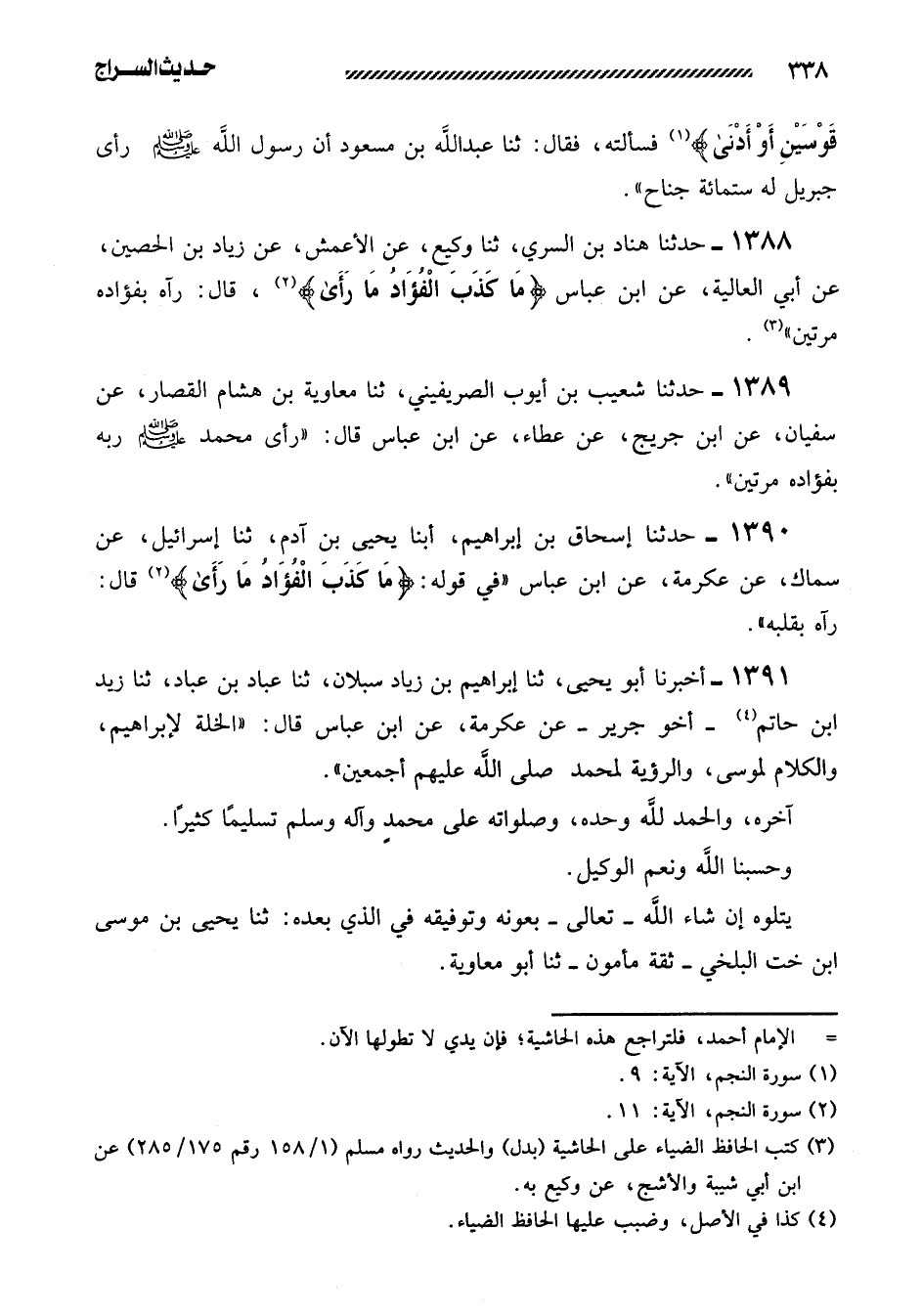 1388- حدثنا هناد بن السري، ثنا وكيع، عن الأعمش، عن زياد بن الحصين، عن أبي الْعَالِيَةِ، عَنِ ابْنِ عَبَّاسٍ {مَا كَذَبَ الْفُؤَادُ ما رأى} ، قال: رآه بفؤاده مرتين)) .
