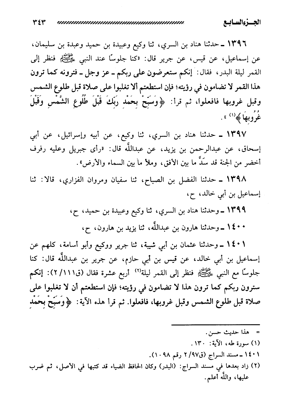 1396- حَدَّثَنَا هَنَّادُ بْنُ السَّرِيِّ، ثنا وَكِيعٌ وَعُبَيْدَةُ بْنُ حُمَيْدٍ وَعَبْدَةُ بْنُ سُلَيْمَانَ، عَنْ إِسْمَاعِيلَ، عَنْ قَيْسٍ، عَنْ جَرِيرٍ قَالَ: (كُنَّا جُلُوسًا عِنْدَ النَّبِيِّ صَلَّى اللَّهُ عَلَيْهِ وَسَلَّمَ فَنَظَرَ إِلَى الْقَمَرِ لَيْلَةَ الْبَدْرِ، فَقَالَ: إِنَّكُمْ سَتُعْرَضُونَ عَلَى رَبِّكُمْ -عَزَّ وَجَلَّ- فَتَرَوْنَهُ كَمَا تَرَوْنَ هَذَا الْقَمَرَ لا تُضَامُونَ فِي رُؤْيَتِهِ؛ فَإِنِ اسْتَطَعْتُمْ أَلا تُغْلَبُوا عَلَى صَلاةٍ قَبْلَ طُلُوعِ الشَّمْسِ وَقَبْلَ غُرُوبِهَا فَافْعَلُوا، ثُمَّ قَرَأَ: {وَسَبِّحْ بِحَمْدِ رَبِّكَ قَبْلَ طُلُوعِ الشَّمْسِ وَقَبْلَ غُرُوبِهَا} )) .