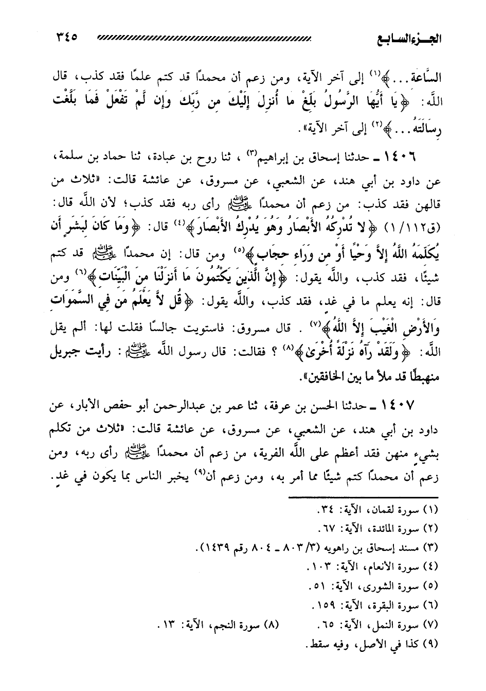1406- حَدَّثَنَا إِسْحَاقُ بْنُ إِبْرَاهِيمَ، ثنا رَوْحُ بْنُ عُبَادَةَ، ثنا حَمَّادُ بْنُ سَلَمَةَ، عَنْ دَاوُدَ بن أبي هند، عن الشعبي، عن مسروق، عَنْ عَائِشَةَ قَالَتْ: ((ثَلاثٌ مَنْ قَالَهُنَّ فَقَدْ كَذَبَ: مَنْ زَعَمَ أَنَّ مُحَمَّدًا صَلَّى اللَّهُ عَلَيْهِ وَسَلَّمَ رَأَى رَبَّهُ فَقَدْ كَذَبَ؛ لأَنَّ الله قال: {لا تُدْرِكُهُ الأَبْصَارُ وَهُوَ يُدْرِكُ الأَبْصَارَ} ، قَالَ: {وَمَا كَانَ لبشرٍ أَنْ يُكَلِّمَهُ اللَّهُ إِلا وحياً أو من وراء حجاب} وَمَنْ قَالَ: أَنَّ مُحَمَّدًا صَلَّى اللَّهُ عَلَيْهِ وَسَلَّمَ قَدْ كَتَمَ شَيْئًا، فَقَدْ كَذَبَ، وَاللَّهُ يَقُولُ: {إِنَّ الَّذِينَ يَكْتُمُونَ مَا أَنْزَلْنَا مِنَ البينات} وَمَنْ قَالَ: أَنَّهُ يَعْلَمُ مَا فِي غدٍ، فَقَدْ كَذَبَ، وَاللَّهُ يَقُولُ: {قُلْ لا يَعْلَمُ مَنْ فِي السَّمَوَاتِ وَالأَرْضِ الْغَيْبَ إِلا اللَّهُ} . قَالَ مَسْرُوقٌ: فَاسْتَوَيْتُ جَالِسًا فَقُلْتُ لَهَا: أَلَمْ يقل الله: {ولقد رآه نزلة أخرى} ؟ فَقَالَتْ: قَالَ رَسُولُ اللَّهِ صَلَّى اللَّهُ عَلَيْهِ وَسَلَّمَ: رَأَيْتُ جِبْرِيلَ مُنْهَبِطًا قَدْ مَلأَ مَا بين الخافقين)) .