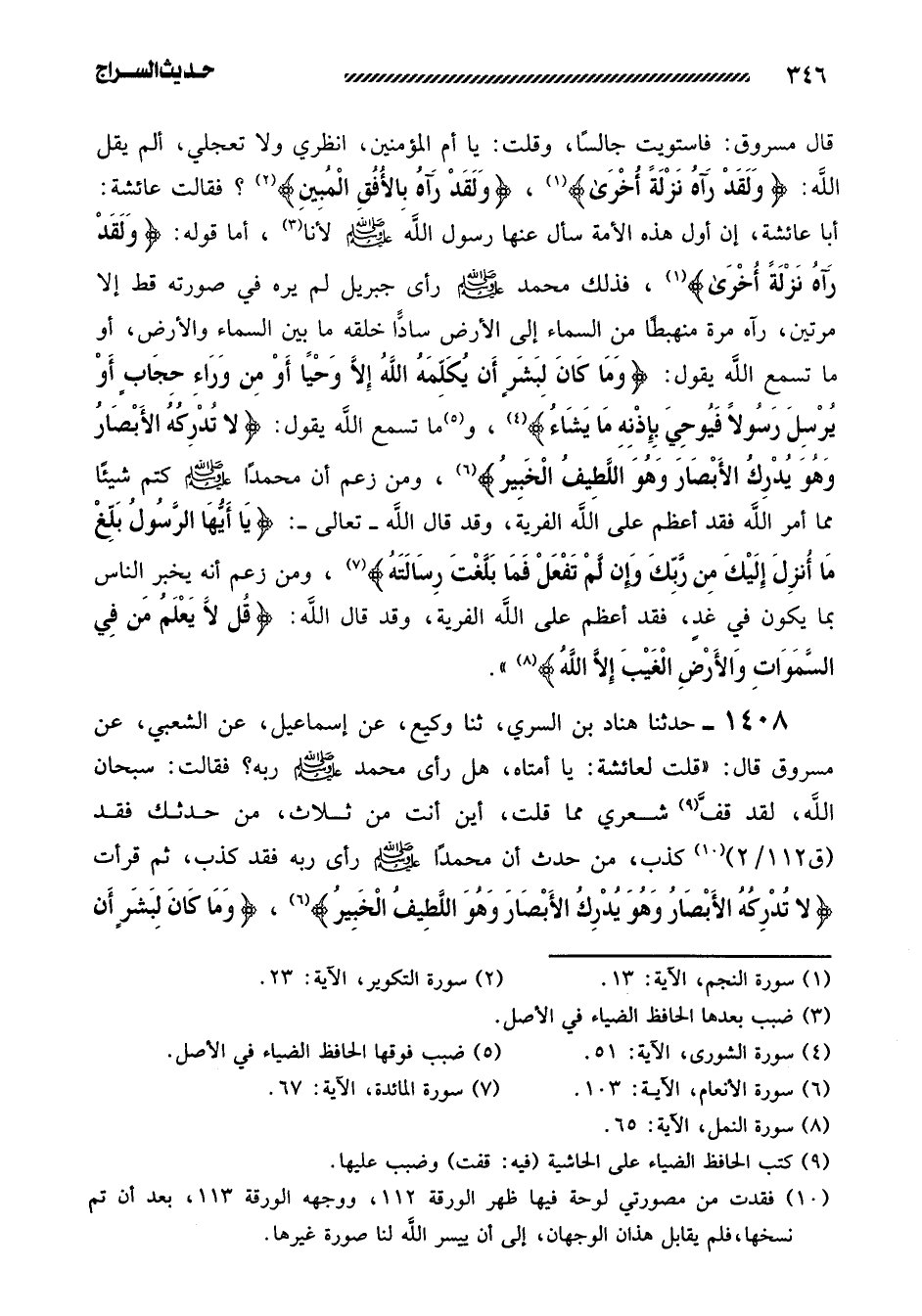 1408- حدثنا هناد بن السري، ثنا وكيع، عن إِسْمَاعِيلَ، عَنِ الشَّعْبِيِّ، عَنْ مَسْرُوقٍ قَالَ: ((قُلْتُ لِعَائِشَةَ: يَا أُمَّتَاهُ، هَلْ رَأَى مُحَمَّدٌ صَلَّى اللَّهُ عَلَيْهِ وَسَلَّمَ رَبَّهُ؟ فَقَالَتْ: سُبْحَانَ اللَّهِ، لَقَدْ قف شَعْرِي مِمَّا قُلْتَ، أَيْنَ أَنْتَ مِنْ ثَلاثٍ، مَنْ حَدَّثَكَ فَقَدْ كَذَبَ، مَنْ حَدَّثَ أَنَّ مُحَمَّدًا صَلَّى اللَّهُ عَلَيْهِ وَسَلَّمَ رَأَى رَبَّهُ فَقَدْ كَذَبَ، ثُمَّ قَرَأَتْ {لا تُدْرِكُهُ الأَبْصَارُ وَهُوَ يُدْرِكُ الأَبْصَارَ وَهُوَ اللَّطِيفُ الخبير} ، {وَمَا كَانَ لبشرٍ أَنْ -[347]- يُكَلِّمَهُ اللَّهُ إِلا وحياً أو من وراء حجاب} ، وَمَنْ حَدَّثَكَ أَنَّهُ يَعْلَمُ مَا فِي غدٍ فَقَدْ كَذَبَ، ثُمَّ قَرَأَتْ: {وَمَا تَدْرِي نفسٌ ماذا تكسب غداً} ، وَمَنْ حَدَّثَكَ أَنَّ مُحَمَّدًا صَلَّى اللَّهُ عَلَيْهِ وَسَلَّمَ كَتَمَ شَيْئًا فَقَدْ كَذَبَ، ثُمَّ قَرَأَتْ: {يا أيها الرَّسُولُ بَلِّغْ مَا أُنْزِلَ إِلَيْكَ مِنْ رَبِّكَ} )) .