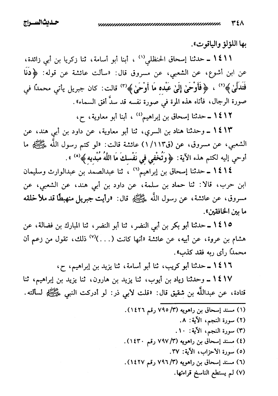 1411- حدثنا إسحاق الحنظلي، أبنا أَبُو أُسَامَةَ، ثنا زَكَرِيَّا بْنُ أَبِي زَائِدَةَ، عن ابن أشوع، عن الشعبي، عن مسروق قال: ((سألت عائشة عن قوله: {دنا فتدلى} ، {فأوحى إلى عبده ما أوحى} قالت: كَانَ جِبْرِيلُ يَأْتِي مُحَمَّدًا فِي صُورَةِ الرِّجَالِ، فَأَتَاهُ هَذِهِ الْمَرَّةَ فِي صُورَةِ نَفْسِهِ قَدْ سَدَّ أُفْقَ السَّمَاءِ)) .