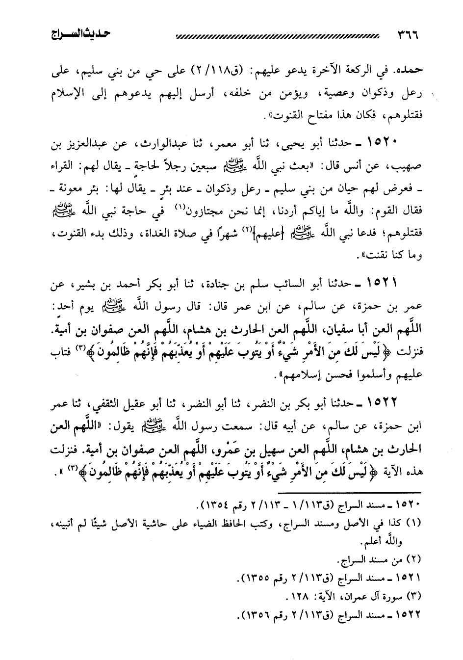 1520- حَدَّثَنَا أَبُو يَحْيَى، ثنا أَبُو مَعْمَرٍ، ثنا عَبْدُ الْوَارِثِ، عَنْ عَبْدِ الْعَزِيزِ بْنِ صُهَيْبٍ، عَنْ أَنَسٍ قَالَ: ((بَعَثَ نَبِيُّ اللَّهِ صَلَّى اللَّهُ عَلَيهِ وَسَلَّمَ سَبْعِينَ رَجُلا لحاجةٍ -يُقَالُ لَهُمُ: الْقُرَّاءُ- فَعَرَضَ لَهُمْ حَيَّانِ مِنْ بَنِي سلمة -رِعْلٌ وَذَكْوَانُ- عِنْدَ بئرٍ -يُقَالُ لَهَا: بِئْرُ مَعُونَةَ- فَقَالَ الْقَوْمُ: وَاللَّهِ مَا إِيَّاكُمْ أَرَدْنَا، إِنَّمَا نَحْنُ مُجْتَازُونَ فِي حَاجَةِ نَبِيِّ اللَّهِ صَلَّى اللَّهُ عَلَيهِ وَسَلَّمَ فَقَتَلُوهُمْ؛ فَدَعَا نَبِيُّ الله صلى الله عليه وسلم [عليهم] شَهْرًا فِي صَلاةِ الْغَدَاةِ، وَذَلِكَ بَدْءُ الْقُنُوتِ، وَمَا كُنَّا نَقْنَتُ)) .