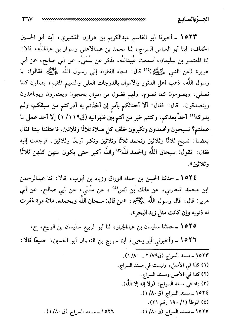 1523- أَخْبَرَنَا أَبُو الْقَاسِمِ عَبْدُ الْكَرِيمِ بْنُ هَوَازِنَ القشيري، أبنا أبو الحسين الخفاف، أبنا أَبُو الْعَبَّاسِ السَّرَّاجُ، ثنا مُحَمَّدُ بْنُ عَبْدِ الأَعْلَى وَسَوَّارُ بْنُ عَبْدِ اللَّهِ، قَالا: ثنا الْمُعْتَمِرُ بْنُ سُلَيْمَانَ، سَمِعْتُ عُبَيْدَ اللَّهِ، يَذْكُرُ عَنْ سُمَيٍّ، عَنْ أَبِي صَالِحٍ، عَنْ أَبِي هريرة (عن النبي صلى الله عليه وسلم) قَالَ: ((جَاءَ الْفُقَرَاءُ إِلَى رَسُولِ اللَّهِ صَلَّى اللَّهُ عَلَيهِ وَسَلَّمَ فَقَالُوا: يَا رَسُولَ اللَّهِ، ذَهَبَ أَهْلُ الدُّثُورِ وَالأَمْوَالِ بِالدَّرَجَاتِ الْعُلَى وَالنَّعِيمِ الْمُقِيمِ، يُصَلُّونَ كَمَا نُصَلِّي، وَيَصُومُونَ كَمَا نَصُومُ، وَلَهُمْ فُضُولٌ مِنْ أموالٍ يَحُجُّونَ وَيَعْتَمِرُونَ وَيُجَاهِدُونَ وَيَتَصَدَّقُونَ. قَالَ: فَقَالَ: أَلا أُحَدِّثُكُمْ بأمرٍ إِنْ أَخَذْتُمْ بِهِ أَدْرَكْتُمْ مَنْ سَبَقَكُمْ، وَلَمْ يُدْرِكْهُ أحدٌ بَعْدَكُمْ، وَكُنْتُمْ خَيْرَ مَنْ أَنْتُمْ بَيْنَ ظَهْرَانَيْهِ إِلا أَحَدٌ عَمِلَ مَا عَمِلْتُمْ؟ تُسَبِّحُونَ وَتَحْمَدُونَ وَتُكَبِّرُونَ خَلْفَ كُلِّ صَلاةٍ ثَلاثًا وَثَلاثِينَ. فَاخْتَلَفْنَا بَيْنَنَا فَقَالَ: بَعْضُنَا: نُسَبِّحُ ثَلاثًا وَثَلاثِينَ وَنَحْمَدُ ثَلاثًا وَثَلاثِينَ وَنُكَبِّرُ أَرْبَعًا وَثَلاثِينَ. فَرَجَعْتُ إِلَيْهِ فَقَالَ: تَقُولُ: سُبْحَانَ اللَّهِ وَالْحَمْدُ لِلَّهِ وَاللَّهُ أَكْبَرُ حَتَّى يَكُونَ مِنْهُنَّ كُلِّهِنَّ ثَلاثًا وثلاثين)) .