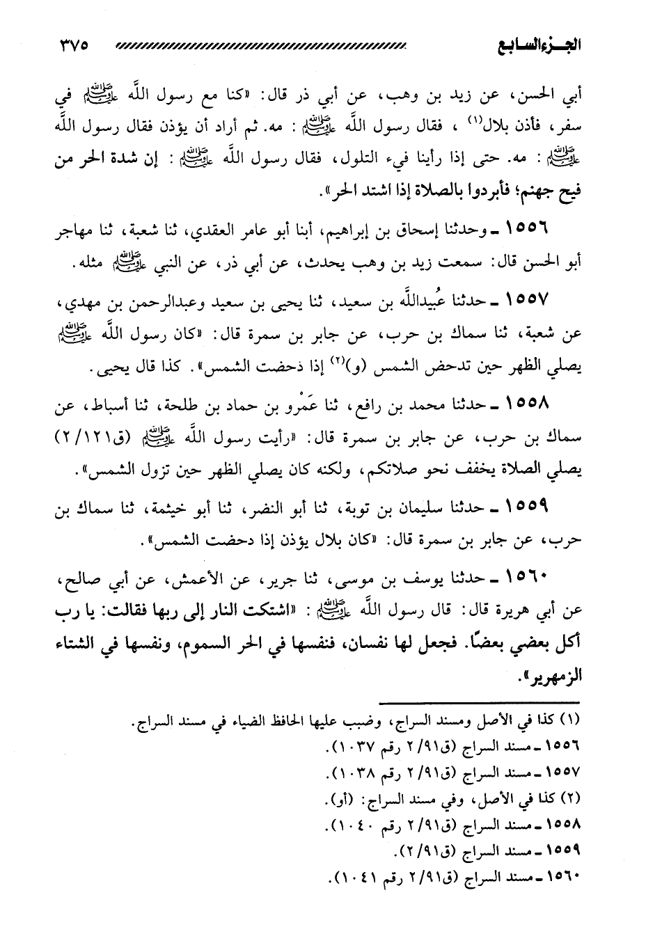 1559- حَدَّثَنَا سُلَيْمَانُ بْنُ تَوْبَةَ، ثنا أَبُو النَّضْرِ، ثنا أَبُو خَيْثَمَةَ، ثنا سِمَاكُ بْنُ حَرْبٍ، عَنْ جَابِرِ بْنِ سَمُرَةَ قَالَ: ((كَانَ بِلالٌ يُؤَذِّنُ إِذَا دَحَضَتِ الشَّمْسُ)) .