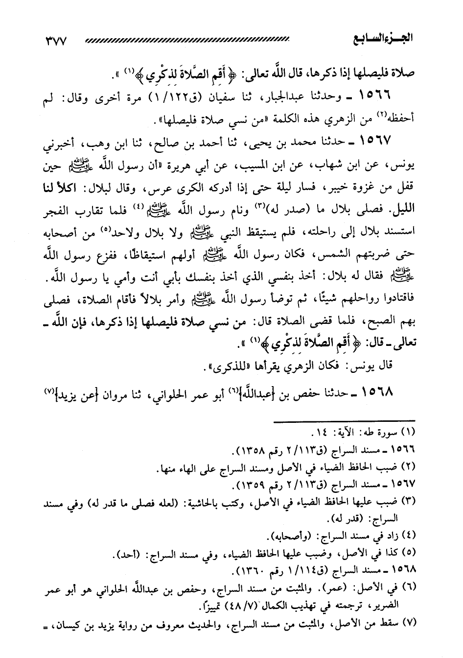 1567- حَدَّثَنَا مُحَمَّدُ بْنُ يَحْيَى، ثنا أَحْمَدُ بْنُ صَالِحٍ، ثنا ابْنُ وَهْبٍ، أَخْبَرَنِي يُونُسُ، عَنِ ابْنِ شِهَابٍ، عَنِ ابْنِ الْمُسَيِّبِ، عَنْ أَبِي هريرة ((أن رسول الله صلى الله عليه وَسَلَّمَ حِينَ قَفَلَ مِنْ غَزْوَةِ خَيْبَرَ، فَسَارَ لَيْلَةً حَتَّى إِذَا أَدْرَكَهُ الْكَرَى عَرَّسَ، وَقَالَ لبلال: اكلأ لنا اللَّيْلَ. فَصَلَّى بِلالٌ مَا (صَدَرَ لَهُ) وَنَامَ رسول الله صلى الله عليه وسلم فلما تقارب الفجر استسند بِلالٌ إِلَى رَاحِلَتِهِ، فَلَمْ يَسْتَيْقِظِ النَّبِيُّ صَلَّى الله عليه وسلم ولا بلال ولا حد مِنْ أَصْحَابِهِ حَتَّى ضَرَبَتْهُمُ الشَّمْسُ، فَكَانَ رَسُولُ اللَّهِ صَلَّى اللَّهُ عَلَيهِ وَسَلَّمَ أَوَّلَهُمُ اسْتِيْقَاظًا، فَفَزِعَ رَسُولُ اللَّهِ صَلَّى اللَّهُ عَلَيهِ وَسَلَّمَ فَقَالَ لَهُ بِلالٌ: أَخَذَ بِنَفْسِي الَّذِي أَخَذَ بِنَفْسِكَ بِأَبِي أَنْتَ وَأُمِّي يَا رَسُولَ اللَّهِ. فَاقْتَادُوا رَوَاحِلَهُمْ شَيْئًا، ثُمَّ تَوَضَّأَ رَسُولُ اللَّهِ صَلَّى اللَّهُ عَلَيهِ وَسَلَّمَ وَأَمَرَ بِلالا فَأَقَامَ الصَّلاةَ، فَصَلَّى بِهِمُ الصُّبْحَ، فَلَمَّا قَضَى الصَّلاةَ قَالَ: مَنْ نَسِيَ صَلاةً فَلْيُصَلِّهَا إِذَا ذَكَرَهَا، فإن الله -تعالى- قال: {أقم الصلاة لذكري} )) .