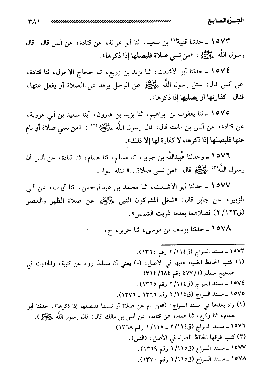 1573- حدثنا قتيبة بن سعيد، ثنا أبو عوانة، عَنْ قَتَادَةَ، عَنْ أَنَسٍ قَالَ: قَالَ رَسُولُ اللَّهِ صَلَّى اللَّهُ عَلَيهِ وَسَلَّمَ: ((مَنْ نَسِيَ صَلاةً فَلْيُصَلِّهَا إِذَا ذَكَرَهَا)) .