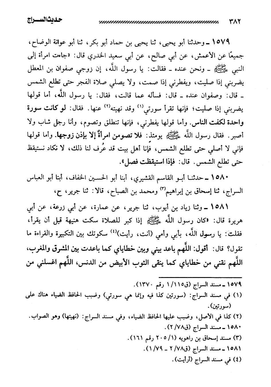 1580- حدثنا أبو القاسم القشيري، أبنا أبو الحسين الخفاف، أبنا أبو العباس السراج، ثنا إسحاق بن إبراهيم، ومحمد بن الصباح، قالا: ثنا جرير، ح،