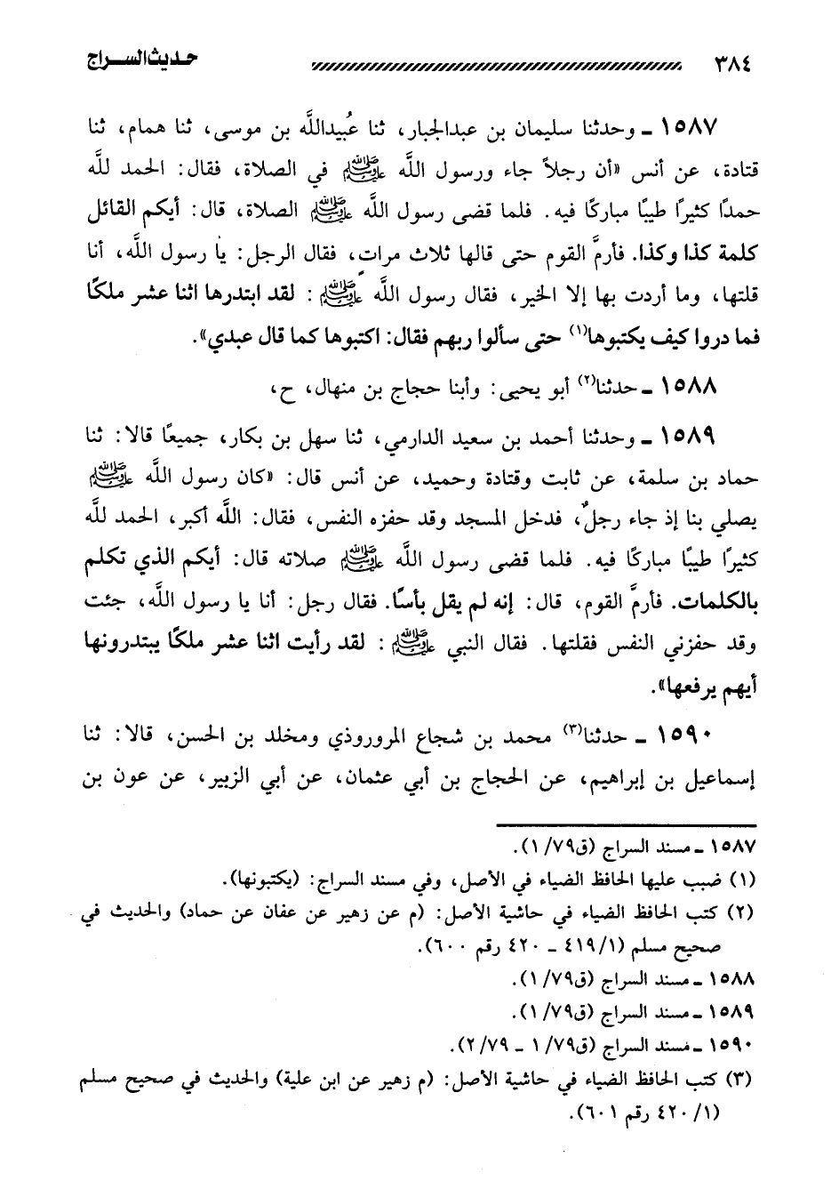 1589- وَحَدَّثَنَا أَحْمَدُ بْنُ سَعِيدٍ الدَّارِمِيُّ، ثنا سَهْلُ بْنُ بَكَّارٍ، جَمِيعًا قَالا: ثنا حَمَّادُ بْنُ سَلَمَةَ، عَنْ ثَابِتٍ وَقَتَادَةَ وَحُمَيْدٍ، عَنْ أَنَسٍ قَالَ: ((كَانَ رَسُولُ الله صلى الله عليه وسلم يصلي بنا إِذْ جَاءَ رجلٌ، فَدَخَلَ الْمَسْجِدَ وَقَدْ حَفَزَهُ النَّفَسُ، فَقَالَ: اللَّهُ أَكْبَرُ، الْحَمْدُ لِلَّهِ كَثِيرًا طَيِّبًا مُبَارَكًا فِيهِ. فَلَمَّا قَضَى رَسُولُ اللَّهِ صلى الله عليه وسلم صلاته قال: أيكم الَّذِي تَكَلَّمَ بِالْكَلِمَاتِ. فَأَرَمَّ الْقَوْمُ، قَالَ: إِنَّهُ لَمْ يَقُلْ بَأْسًا. فَقَالَ رَجُلٌ: أَنَا يَا رسول الله، جئت وقد حفزني النفس فقلتها. فقال النبي صلى الله عليه وسلم: لقد رأيت اثنا عَشَرَ مَلَكًا يَبْتَدِرُونَهَا أَيُّهُمْ يَرْفَعُهَا)) .