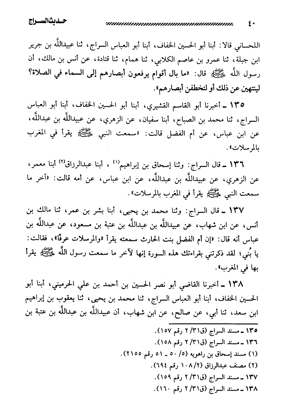 135- أخبرنا أبو القاسم القشيري، أبنا أبو الحسين الخفاف، أبنا أبو العباس السراج، ثنا محمد بن الصباح، أبنا سُفْيَانُ، عَنِ الزُّهْرِيِّ، عَنْ عُبَيْدِ اللَّهِ بْنِ عَبْدِ اللَّهِ، عَنِ ابْنِ عَبَّاسٍ، عَنْ أُمِّ الْفَضْلِ قَالَتْ: ((سَمِعْتُ النَّبِيَّ صَلَّى اللَّهُ عَلَيْهِ وَسَلَّمَ يَقْرَأُ فِي الْمَغْرِبِ بِالْمُرْسَلاتِ)) .