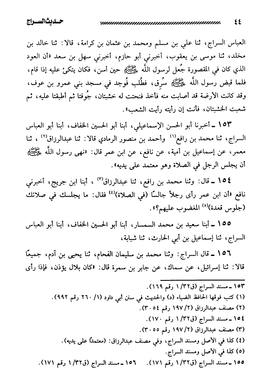 153- أخبرنا أبو الحسن الإسماعيلي، أبنا أبو الحسين الخفاف، أبنا أبو العباس السراج، ثنا محمد بن رافع وَأَحْمَدُ بْنُ مَنْصُورٍ الرَّمَادِيُّ قَالا: ثَنَا عَبْدُ الرَّزَّاقِ، ثَنَا مَعْمَرٌ، عَنْ إِسْمَاعِيلَ بْنِ أُمَيَّةَ، عَنْ نَافِعٍ، عَنِ ابْنِ عُمَرَ قَالَ: ((نَهَى رسول الله صلى الله عليه وسلم أن يَجْلِسَ الرَّجُلُ فِي الصلَّاة وَهُوَ معُتْمِدٌ عَلَى يديه)) .