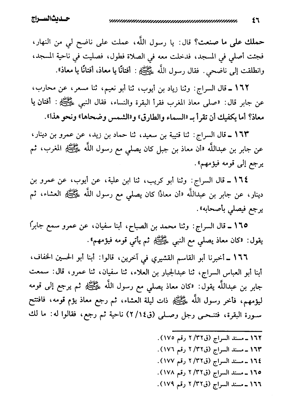 162- قال السراج: وثنا زياد بن أيوب، ثنا أبو نعيم، ثنا مِسْعَرٌ، عَنْ مُحَارِبٍ، عَنْ جَابِرٍ قَالَ: (صَلَّى مُعَاذٌ الْمَغْرِبَ فَقَرَأ الْبَقَرَةَ وَالنِّسَاءَ، فَقَالَ النَّبِيُّ صَلَّى اللَّهُ عَلَيْهِ وَسَلَّمَ: أَفَتَّانٌ يَا مُعَاذُ؟ أما يكفيك أن تقرأ بـ ((السماء والطارق)) و ((الشمس وضحاها)) ونحو هذا)) .