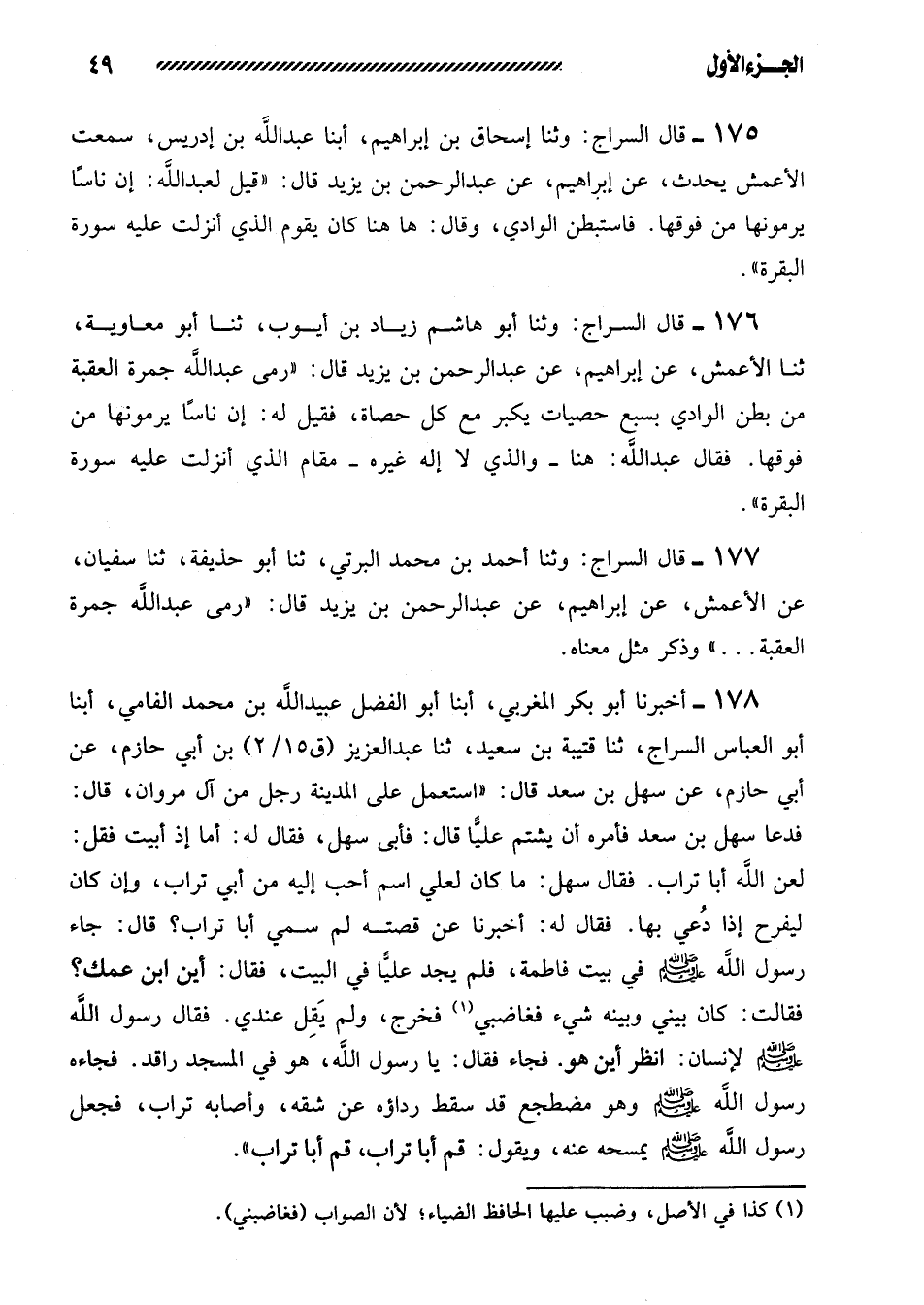 176- قال السراج: وثنا أَبُو هَاشِمٍ زِيَادُ بْنُ أَيُّوبَ، ثَنَا أَبُو مُعَاوِيَةَ، ثَنَا الأَعْمَشُ، عَنْ إِبْرَاهِيمَ، عَنْ عَبْدِ الرحمن بن يزيد قال: ((رمى عبد الله جَمْرَةَ الْعَقَبَةِ مِنْ بَطْنِ الْوَادِي بِسَبْعِ حَصَيَاتٍ يُكَبِّرُ مَعَ كُلِّ حَصَاةٍ، فَقِيلَ لَهُ: إِنَّ نَاسًا يَرْمُونَهَا مِنْ فَوْقِهَا. فَقَالَ عَبْدُ اللَّهِ: هنا -وَالَّذِي لا إِلَهَ غَيْرُهُ- مَقَامُ الَّذِي أُنْزِلَتْ عَلَيْهِ سُورَةُ الْبَقَرَةِ)) .