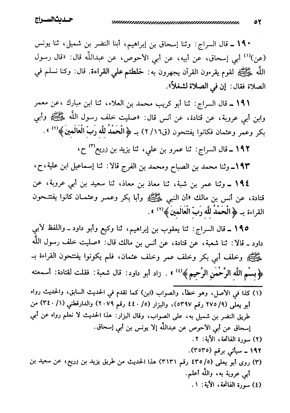 191- قَالَ السَّرَّاجُ: ثَنَا أَبُو كُرَيْبٍ مُحَمَّدُ بْنُ العلاء، ثنا ابْنُ الْمُبَارَكِ، عَنْ مَعْمَرٍ وَابْنِ أَبِي عَرُوبَةَ، عَنْ قَتَادَةَ، عَنْ أَنَسٍ قَالَ: ((صَلَّيْتُ خلف رسول الله صلى الله عليه وسلم وأبي بكر وعمر وعثمان فكانوا يفتتحون بـ {الحمد لله رب العالمين} .