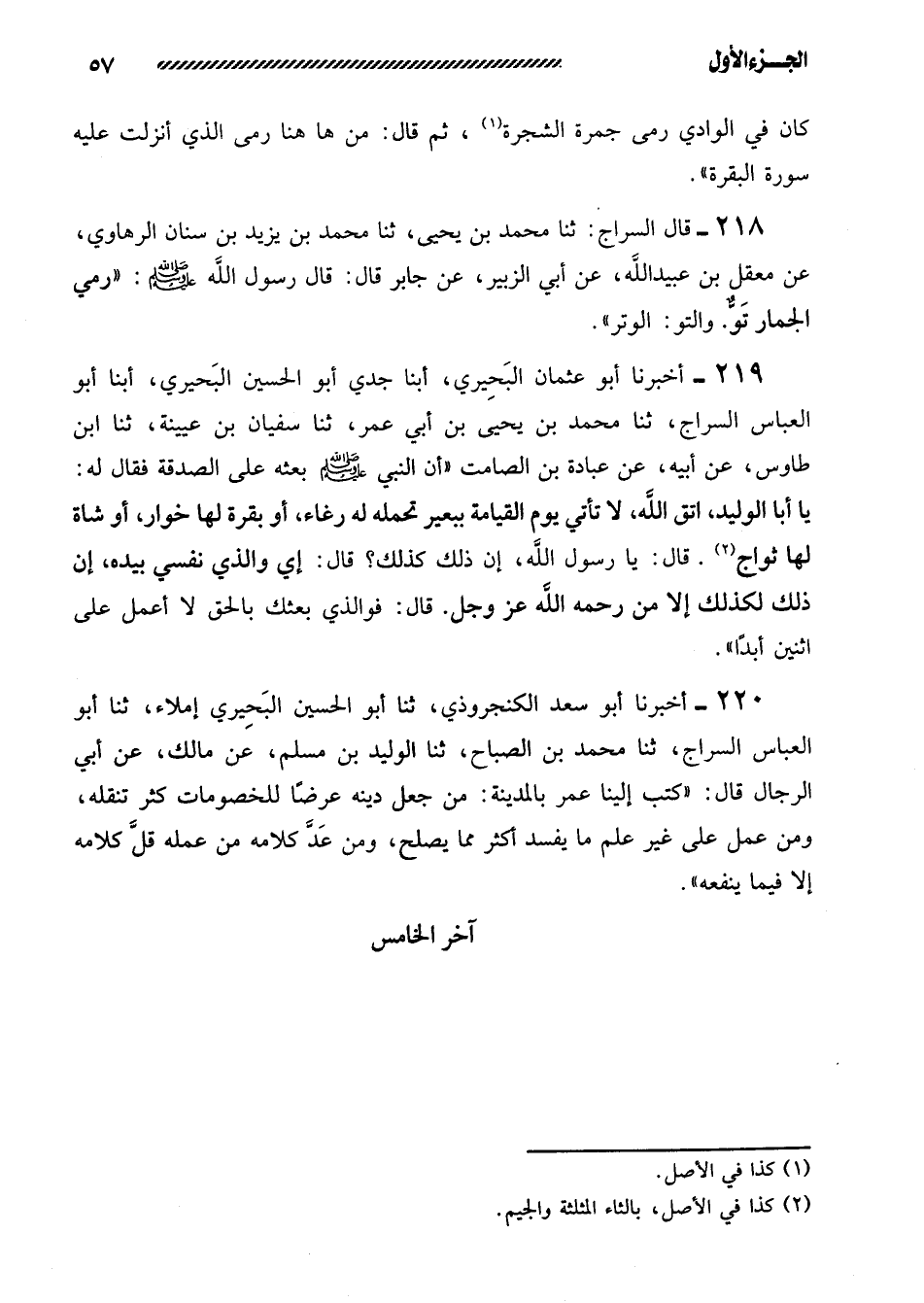 219- أخبرنا أبو عثمان البحيري، أبنا جدي أبو الحسين البحيري، أبنا أبو العباس السراج، ثنا محمد بن يحيى بن أبي عمر، ثنا سفيان بن عيينة، ثَنَا ابْنُ طَاوُسٍ، عَنْ أَبِيهِ، عَنْ عُبَادَةَ بْنِ الصَّامِتِ ((أَنَّ النَّبِيَّ صَلَّى اللَّهُ عَلَيْهِ وَسَلَّمَ بَعَثَهُ عَلَى الصَّدَقَةِ فَقَالَ لَهُ: يَا أَبَا الْوَلِيدِ، اتَّقِ اللَّهَ، لا تَأْتِي يَوْمَ الْقِيَامَةِ بِبَعِيرٍ تَحْمِلُهُ لَهُ رُغَاءٌ، أَوْ بَقَرَةٍ لها خوار، أو شاة لها ثواج. قَالَ: يَا رَسُولَ اللَّهِ، إِنَّ ذَلِكَ كَذَلِكَ؟ قَالَ: أَيْ وَالَّذِي نَفْسِي بِيَدِهِ، إِنَّ ذَلِكَ لَكَذَلِكَ إِلا مَنْ رَحِمَهُ اللَّهُ عَزَّ وَجَلَّ. قَالَ: فَوَالَّذِي بَعَثَكَ بِالْحَقِّ لا أَعْمَلُ عَلَى اثنين أبداً)) .