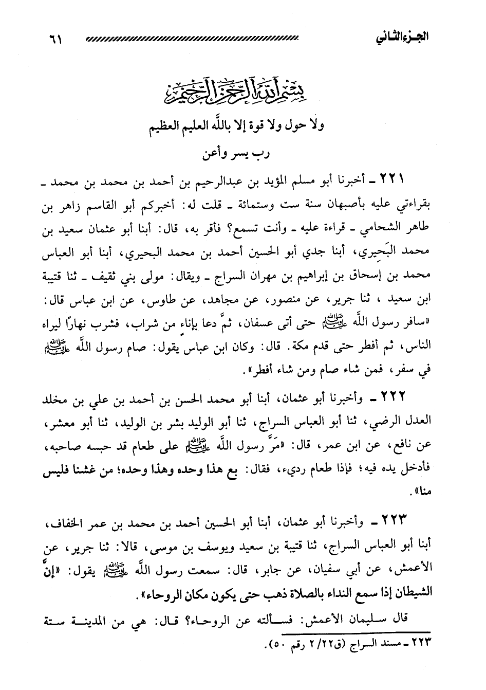 221- أَخْبَرَنَا أَبُو مُسْلِمٍ الْمُؤَيَّدُ بْنُ عَبْدِ الرَّحِيمِ بن أحمد بن محمد بن محمد -بقراءتي عَلَيْهِ بِأَصْبَهَانَ سَنَةَ سِتٍّ وَسِتِّمِائَةٍ- قُلْتُ لَهُ: أَخْبَرَكُمْ أَبُو الْقَاسِمِ زَاهِرُ بْنُ طَاهِرٍ الشَّحَّامِيُّ -قِرَاءَةً عَلَيْهِ- وَأَنْتَ تَسْمَعُ؟ فَأَقَرَّ بِهِ، قَالَ: أبنا أبو عثمان سعيد بن محمد البحيري، أبنا جَدِّي أَبُو الْحُسَيْنِ أَحْمَدُ بْنُ مُحَمَّدٍ الْبَحِيرِيُّ، أبنا أَبُو الْعَبَّاسِ مُحَمَّدُ بْنُ إِسْحَاقَ بْنِ إِبْرَاهِيمَ بْنِ مِهْرَانَ السَّرَّاجُ *وَيُقَالُ: مَوْلَى بَنِي ثَقِيفٍ- ثنا قتيبة ابن سَعِيدٍ، ثَنَا جَرِيرٌ، عَنْ مَنْصُورٍ، عَنْ مُجَاهِدٍ، عَنْ طَاوُسٍ، عَنِ ابْنِ عَبَّاسٍ قَالَ: ((سَافَرَ رسول الله صلى الله عليه وسلم حتى أَتَى عُسْفَانَ، ثُمَّ دَعَا بإناءٍ مِنْ شَرَابٍ، فَشَرِبَ نَهَارًا لِيَرَاهُ النَّاسُ، ثُمَّ أَفْطَرَ حَتَّى قَدِمَ مَكَّةَ. قَالَ: وَكَانَ ابْنُ عَبَّاسٍ يَقُولُ: صَامَ رَسُولُ اللَّهِ صَلَّى اللَّهُ عَلَيْهِ وَسَلَّمَ فِي سَفَرٍ، فَمَنْ شَاءَ صَامَ وَمَنْ شَاءَ أفطر)) .