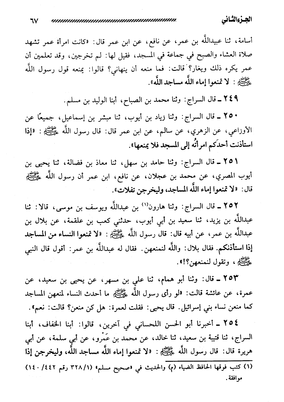 252- قال السراج: وثنا هارون بن عبد الله وَيُوسُفُ بْنُ مُوسَى، قَالا: ثَنَا عَبْدُ اللَّهِ بْنُ يَزِيدَ، ثَنَا سَعِيدُ بْنُ أَبِي أَيُّوبَ، حَدَّثَنِي كَعْبُ بْنُ عَلْقَمَةَ، عَنْ بِلالِ بْنِ عَبْدِ اللَّهِ بْنِ عُمَرَ، عَنْ أَبِيهِ قَالَ: قال رسول الله صلى الله عليه وسلم: ((لا تَمْنَعُوا النِّسَاءَ مِنَ الْمَسَاجِدِ إِذَا اسْتَأْذَنَّكُمْ. فَقَالَ بِلالٌ: وَاللَّهِ لَنَمْنَعُهُنَّ. فَقَالَ لَهُ عَبْدُ اللَّهِ بْنُ عُمَرَ: أَقُولُ قَالَ النَّبِيُّ صَلَّى اللَّهُ عَلَيْهِ وَسَلَّمَ، وَتَقُولُ لَنَمْنَعُهُنَّ؟!)) .