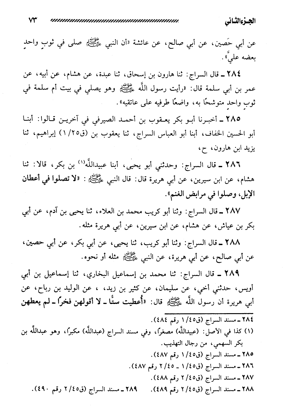 286- قَالَ السَّرَّاجُ: وَحَدَّثَنِي أَبُو يَحْيَى، أبنا عبيد الله بن بكر، قالا: ثنا هشام، عن ابن سيرين، عن أبي هريرة قال: قال النبي صلى الله عليه وسلم: ((لا تُصَلُّوا فِي أَعْطَانِ الإِبِلِ، وَصَلُّوا فِي مرابض الغنم)) .