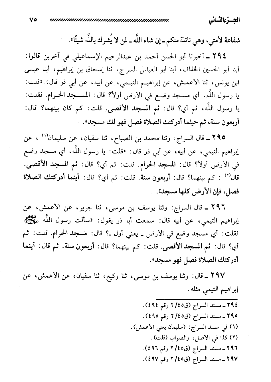 296- قال السراج: وثنا يوسف بن موسى، ثنا جَرِيرٌ، عَنِ الأَعْمَشِ، عَنْ إِبْرَاهِيمَ التَّيْمِيِّ، عَنْ أَبِيهِ قَالَ: سَمِعْتُ أَبَا ذَرٍّ يَقُولُ: ((سَأَلْتُ رسول الله صلى الله عليه وسلم فقلت: أي مسجد وضع في الأرض -يعني أول-؟ قال: مسجد الْحَرَامُ. قُلْتُ: ثُمَّ أَيُّ؟ قَالَ: ثُمَّ الْمَسْجِدُ الأَقْصَى. قُلْتُ: كَمْ بَيْنَهُمَا؟ قَالَ: أَرْبَعُونَ سَنَةً. ثُمَّ قَالَ: أَيْنَمَا أَدْرَكَتْكَ الصَّلاةُ فَصَلِّ فَهُوَ مسجد)) .