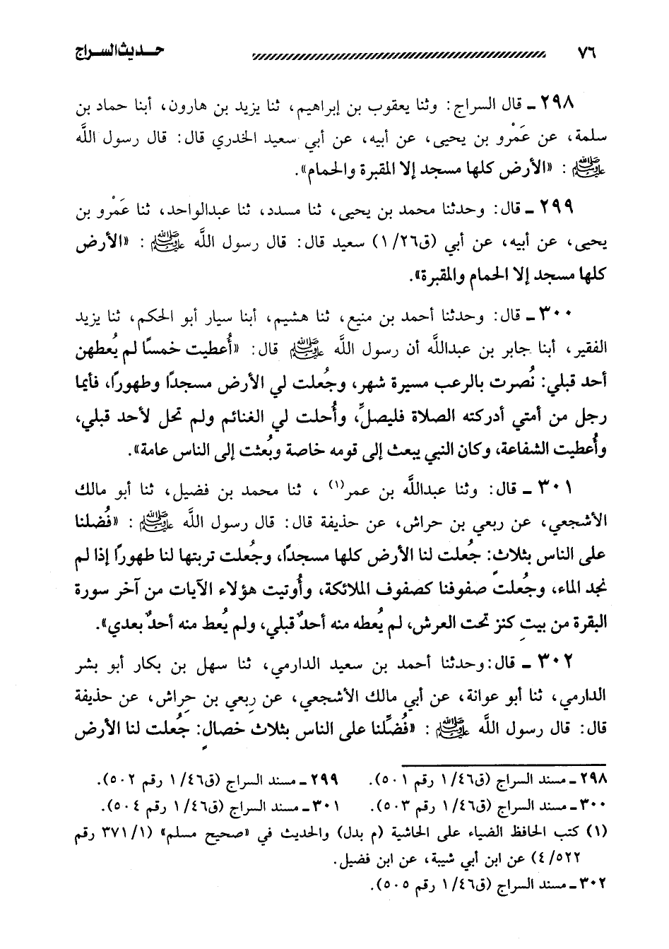 298- قال السراج: وثنا يعقوب بن إبراهيم، ثنا يزيد بن هارون، أبنا حماد بن سلمة، عن عمرو بن يحيى، عَنْ أَبِيهِ، عَنْ أَبِي سَعِيدٍ الْخُدْرِيِّ قَالَ: قال رسول الله صلى الله عليه وسلم: ((الأَرْضُ كُلُّهَا مَسْجِدٌ إِلا الْمَقْبَرَةَ وَالْحَمَّامَ)) .