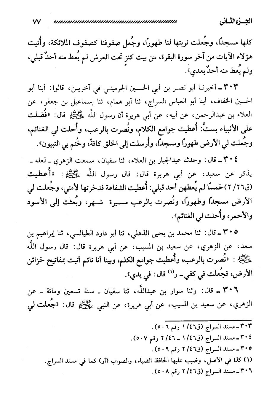 303- أَخْبَرَنَا أَبُو نَصْرِ بْنُ أَبِي الْحُسَيْنِ الْحرمينِيُّ في آخرين، قالوا: أبنا أبو الحسين الخفاف، أبنا أَبُو الْعَبَّاسِ السَّرَّاجُ، ثَنَا أَبُو هَمَّامٍ، ثَنَا إِسْمَاعِيلُ بْنُ جَعْفَرٍ، عَنِ الْعَلاءِ بْنِ عَبْدِ الرَّحْمَنِ، عَنْ أَبِيهِ، عَنْ أَبِي هُرَيْرَةَ أَنَّ رسول الله صلى الله عليه وسلم قال: ((فضلت على الأنبياء بست: أعطيت جوامع الكلام، وَنُصِرْتُ بِالرُّعْبِ، وَأُحِلَّتْ لِيَ الْغَنَائِمُ، وَجُعِلَتْ لِيَ الأَرْضُ طَهُورًا وَمَسْجِدًا، وَأُرْسِلْتُ إِلَى الْخَلْقِ كَافَّةً، وَخُتِمَ بِيَ النَّبِيُّونَ)) .