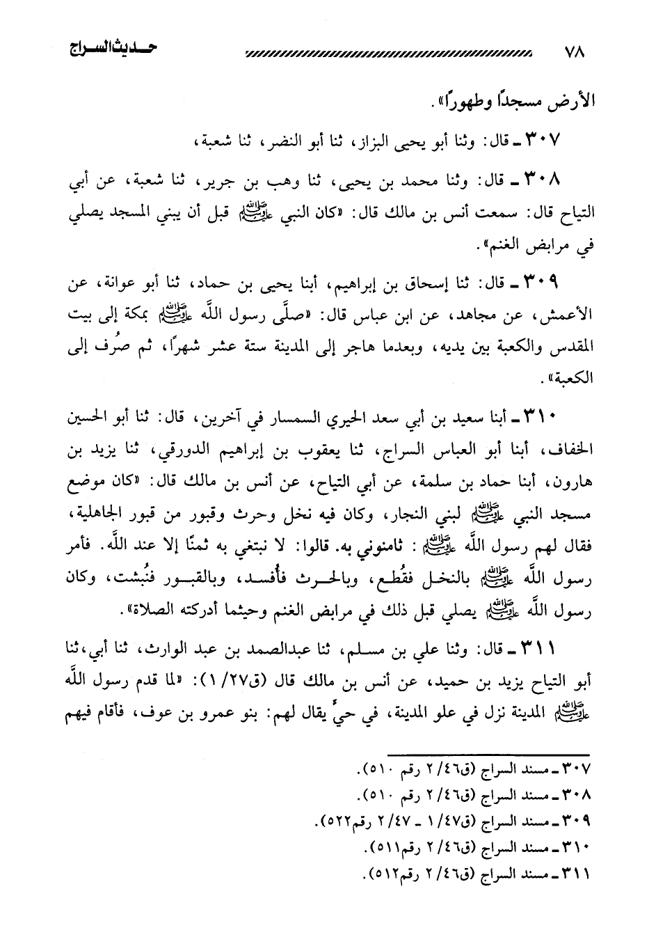 308- قال: وثنا مُحَمَّدُ بْنُ يَحْيَى، ثنا وَهْبُ بْنُ جرير، ثَنَا شُعْبَةُ، عَنْ أَبِي التَّيَّاحِ قَالَ: سَمِعْتُ أنس بن مالك قال: ((كان النبي صلى اللَّهُ عَلَيْهِ وَسَلَّمَ قَبْلَ أَنْ يَبْنِيَ الْمَسْجِدَ يُصَلِّي فِي مَرَابِضِ الْغَنَمِ)) .