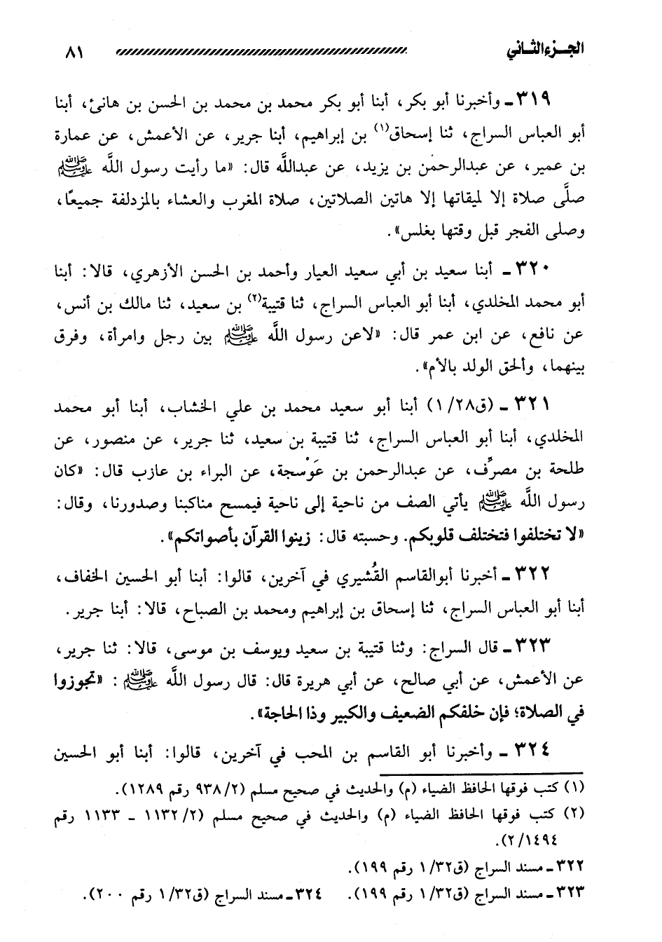 322- أخبرنا أبو القاسم القشيري في آخرين، قالوا: أبنا أبو الحسين الخفاف، أبنا أبو العباس السراج، ثنا إسحاق بن إبراهيم ومحمد بن الصباح، قالا: أبنا جَرِيرٌ.