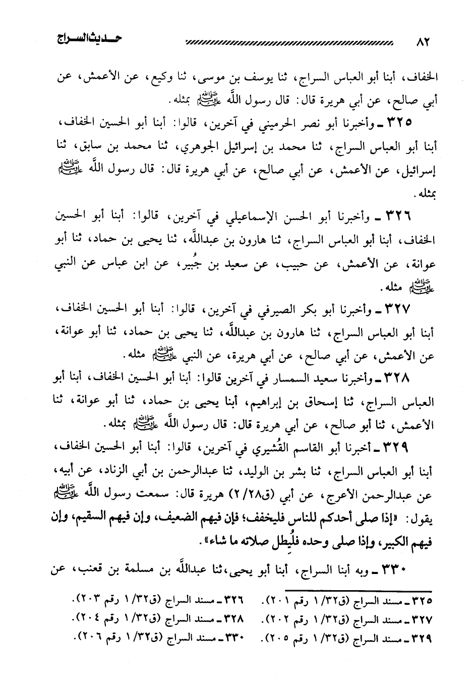 329- أخبرنا أبو القاسم القشيري في آخرين، قالوا: أبنا أبو الحسين الخفاف، أبنا أَبُو الْعَبَّاسِ السَّرَّاجُ، ثَنَا بِشْرُ بْنُ الْوَلِيدِ، ثنا عبد الرحمن بن أبي الزناد، عن أَبِيهِ، عَنْ عَبْدِ الرَّحْمَنِ الأَعْرَجِ، عَنْ أَبِي هُرَيْرَةَ قَالَ: سَمِعْتُ رَسُولَ اللَّهِ صَلَّى اللَّهُ عَلَيْهِ وَسَلَّمَ يَقُولُ: ((إِذَا صَلَّى أَحَدُكُمْ لِلنَّاسِ فَلْيُخَفِّفْ؛ فَإِنَّ فِيهِمُ الضَّعِيفَ، وَإِنَّ فِيهِمُ السَّقِيمَ، وَإِنَّ فِيهِمُ الْكَبِيرَ، وَإِذَا صَلَّى وَحْدَهُ فَلْيُطِلْ صلاته ما شاء)) .