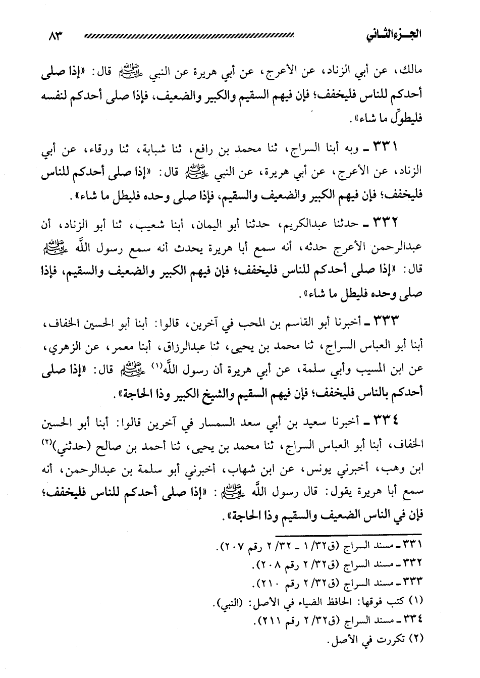 333- أَخْبَرَنَا أَبُو الْقَاسِمِ بْنُ الْمُحِبِّ فِي آخَرِينَ، قالوا: أبنا أبو الحسن الخفاف، أبنا أبو العباس السراج، ثنا محمد بن يحيى، ثنا عبد الرزاق، أبنا مَعْمَرٌ، عَنِ الزُّهْرِيِّ، عَنِ ابْنِ الْمُسَيِّبِ وَأَبِي سَلَمَةَ، عَنْ أَبِي هُرَيْرَةَ أَنَّ رَسُولَ اللَّهِ صلى الله عليه وسلم قال: ((إذا صلى أَحَدُكُمْ بِالنَّاسِ فَلْيُخَفِّفْ؛ فَإِنَّ فِيهِمُ السَّقِيمَ وَالشَّيْخَ الْكَبِيرَ وَذَا الْحَاجَةِ)) .