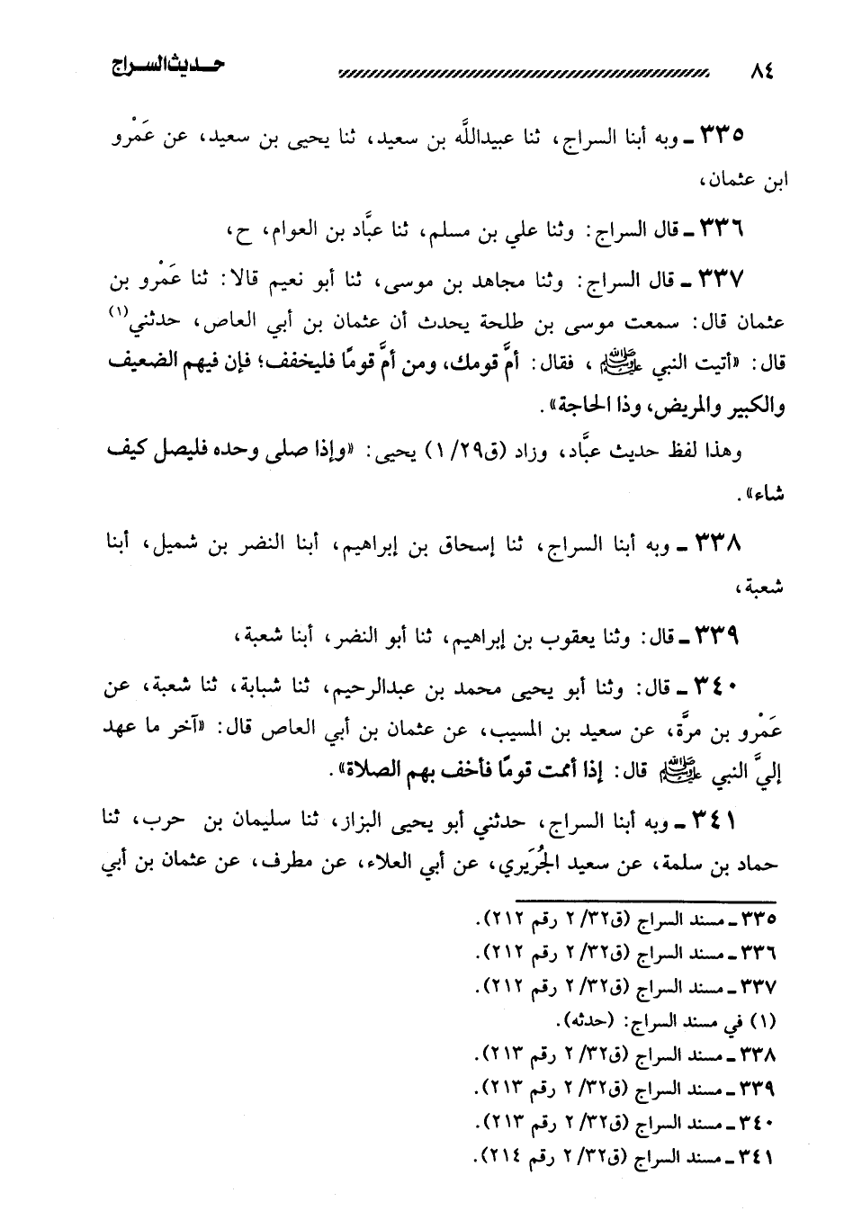 337- قال السراج: وثنا مجاهد بن موسى، ثنا أبو نعيم قالا: ثنا عَمْرُو بْنُ عُثْمَانَ قَالَ: سَمِعْتُ مُوسَى بْنَ طَلْحَةَ يُحَدِّثُ أَنَّ عُثْمَانَ بْنَ أَبِي الْعَاصِ، حَدَّثَنِي قَالَ: ((أَتَيْتُ النَّبِيَّ صَلَّى اللَّهُ عَلَيْهِ وَسَلَّمَ، فَقَالَ: أُمَّ قَوْمَكَ، وَمَنْ أَمَّ قَوْمًا فَلْيُخَفِّفْ؛ فَإِنَّ فِيهِمُ الضَّعِيفَ وَالْكَبِيرَ وَالْمَرِيضَ، وَذَا الْحَاجَةِ)) .