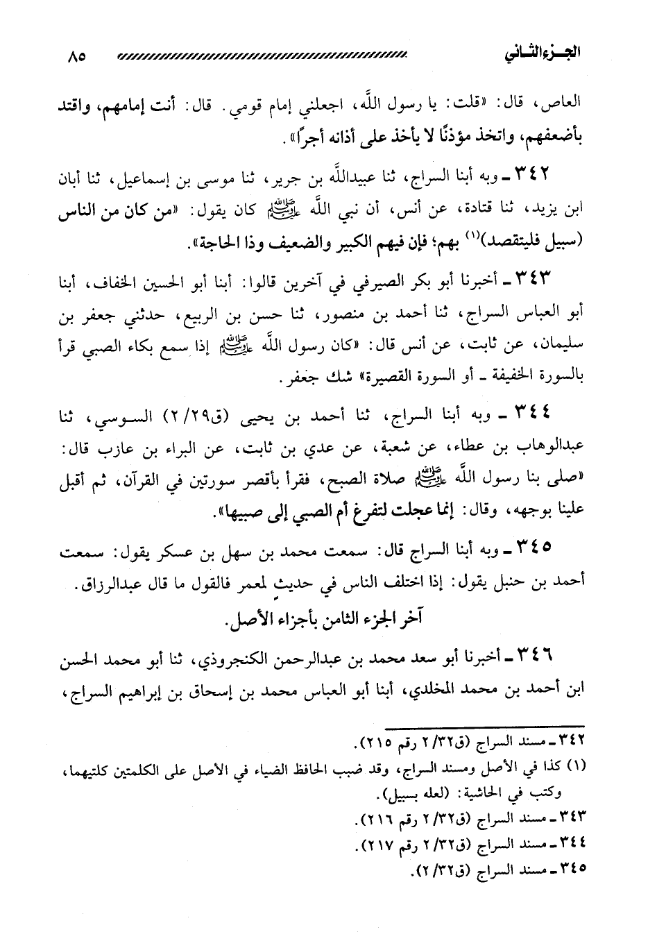342- وبه أبنا السراج، ثنا عبيد الله بن جرير، ثنا موسى بن إسماعيل، ثنا أبان ابن يَزِيدَ، ثَنَا قَتَادَةُ، عَنْ أَنَسٍ، أَنَّ نَبِيَّ الله صلى الله عليه وسلم كان يقول: ((من كان من الناس (سبيل فليتقصد) بِهِمْ؛ فَإِنَّ فِيهِمُ الْكَبِيرَ وَالضَّعِيفَ وَذَا الْحَاجَةِ)) .