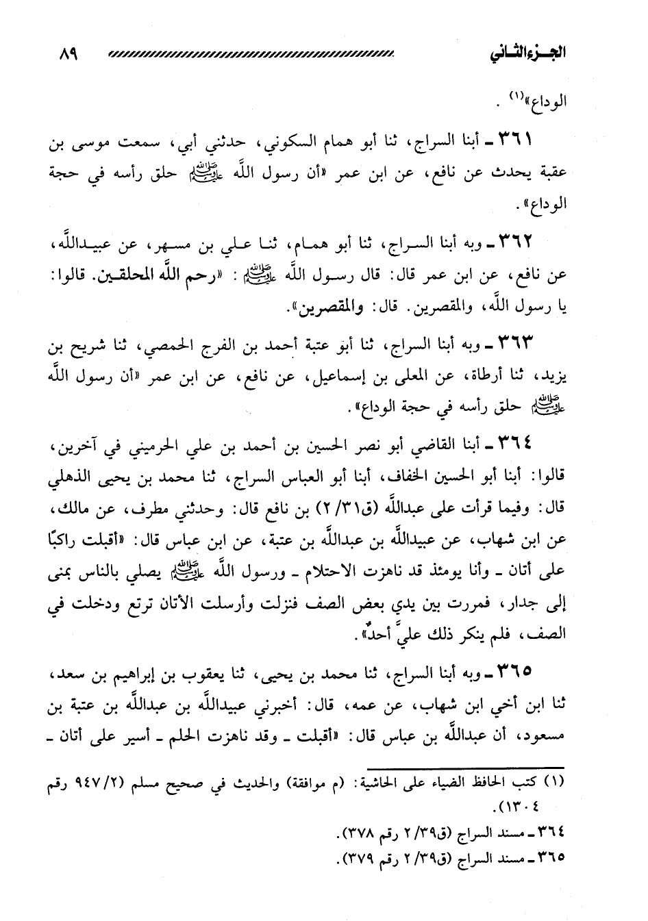 361- أبنا السَّرَّاجُ، ثَنَا أَبُو هَمَّامٍ السَّكُونِيُّ، حَدَّثَنِي أَبِي، سَمِعْتُ مُوسَى بْنَ عُقْبَةَ يُحَدِّثُ عَنْ نَافِعٍ، عن ابن عمر ((أن رسول الله صلى الله عليه وسلم حلق رأسه في حجة الوداع)) .