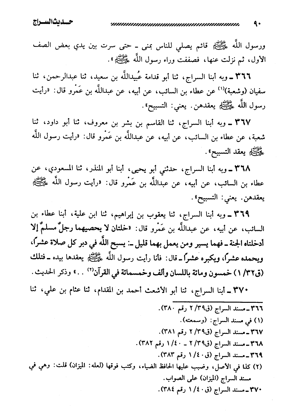 366- وبه أبنا السراج، ثنا أبو قدامة عبيد الله بن سَعِيدٍ، ثَنَا عَبْدُ الرَّحْمَنِ، ثَنَا سُفْيَانُ (وَشُعْبَةُ) عَنْ عَطَاءِ بْنِ السَّائِبِ، عَنْ أَبِيهِ، عَنْ عَبْدِ اللَّهِ بْنِ عَمْرٍو قَالَ: ((رَأَيْتُ رَسُولَ اللَّهِ صَلَّى اللَّهُ عَلَيْهِ وَسَلَّمَ يَعْقِدُهُنَّ. يَعْنِي: التسبيح)) .