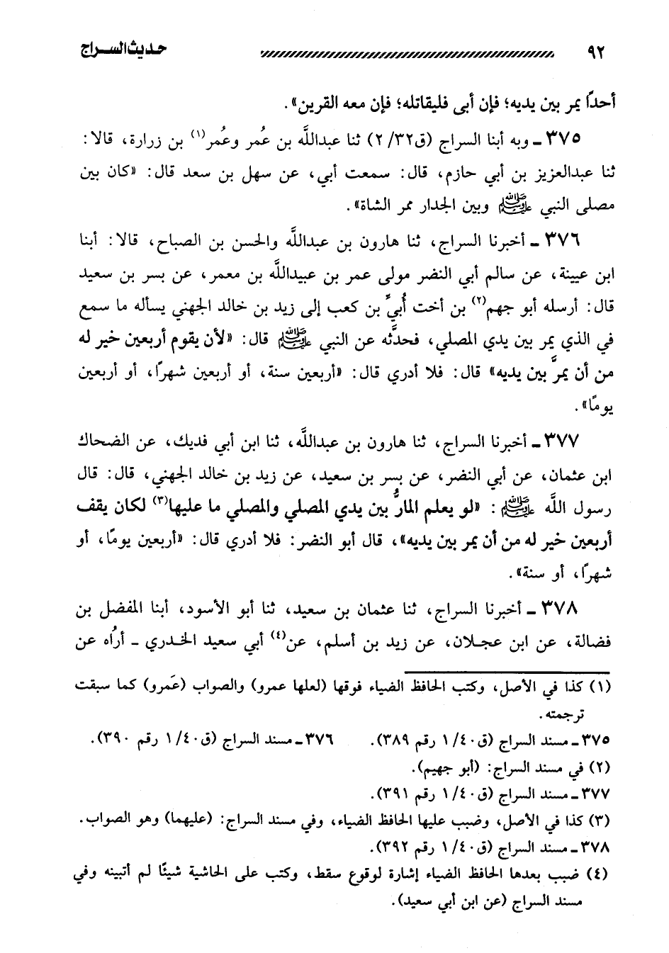 376- أخبرنا السراج، ثنا هارون بن عبد الله والحسن بن الصباح، قالا: أبنا ابْنُ عُيَيْنَةَ، عَنْ سَالِمٍ أَبِي النَّضْرِ مَوْلَى عُمَرَ بْنِ عُبَيْدِ اللَّهِ بْنِ مَعْمَرٍ، عَنْ بُسْرِ بْنِ سَعِيدٍ قَالَ: أَرْسَلَهُ أَبُو جَهْمٍ بن أُخْتِ أُبَيِّ بْنِ كَعْبٍ إِلَى زَيْدِ بْنِ خَالِدٍ الْجُهَنِيِّ يَسْأَلُهُ مَا سَمِعَ فِي الَّذِي يَمُرُّ بَيْنَ يَدَيِ الْمُصَلِّي، فَحَدَّثَهُ عَنِ النَّبِيِّ صَلَّى اللَّهُ عَلَيْهِ وَسَلَّمَ قَالَ: ((لأَنْ يَقُومَ أَرْبَعِينَ خَيْرٌ لَهُ مِنْ أَنْ يَمُرَّ بَيْنَ يَدَيْهِ)) قَالَ: فَلا أَدْرِي قَالَ: ((أَرْبَعِينَ سَنَةً، أَوْ أَرْبَعِينَ شَهْرًا، أَوْ أَرْبَعِينَ يَوْمًا)) .