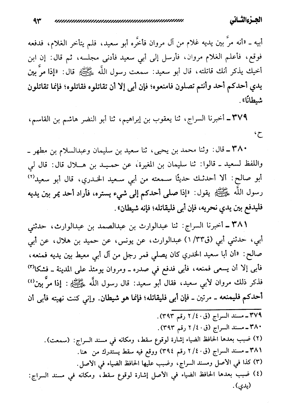 381- أَخْبَرَنَا السَّرَّاجُ: ثَنَا عَبْدُ الْوَارِثِ بْنُ عَبْدِ الصَّمَدِ بْنِ عَبْدِ الْوَارِثِ، حَدَّثَنِي أَبِي، حَدَّثَنِي أَبِي عَبْدِ الْوَارِثِ، عَنْ يُونُسَ، عَنْ حُمَيْدِ بْنِ هِلالٍ، عَنْ أَبِي صَالِحٍ: ((أَنَّ أَبَا سَعِيدٍ الْخُدْرِيَّ كَانَ يُصَلِّي فَمَرَّ رَجُلٌ مِنْ آلِ أَبِي مُعَيْطٍ بَيْنَ يَدَيْهِ فَمَنَعَهُ، فَأَبَى إِلا أَنْ يَسْعَى فَمَنَعَهُ، فَأَبَى فَدَفَعَ فِي صدره -ومروان يومئذ على المدينة- فشكا فَذَكَرَ ذَلِكَ مَرْوَانُ لأَبِي سَعِيدٍ، فَقَالَ أَبُو سَعِيدٍ: قَالَ رَسُولُ اللَّهِ صَلَّى اللَّهُ عَلَيْهِ وسلم: إذا مر بين أحدكم فَلْيَمْنَعْهُ- مَرَّتَيْنِ فَإِنْ أَبَى فَلْيُقَاتِلْهُ؛ فَإِنَّمَا هُوَ شَيْطَانٌ. وَإِنِّي كُنْتُ نَهَيْتُهُ فَأَبَى أَنْ -[94]- يَنْتَهِيَ)) .