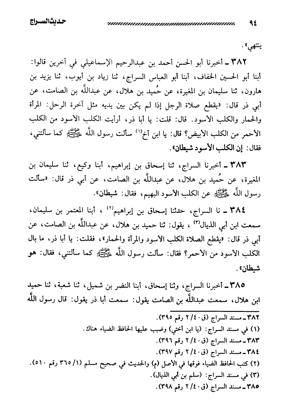 384- نا السراج، حدثنا إسحاق بن إبراهيم، أبنا الْمُعْتَمِرُ بْنُ سُلَيْمَانَ، سَمِعْتُ ابْنَ أَبِي الذَّيَّالِ، يَقُولُ: ثَنَا حُمَيْدُ بْنُ هِلالٍ، عَنْ عَبْدِ الله بن الصامت، عن أبي ذر قال: ((يَقْطَعُ الصَّلاةَ الْكَلْبُ الأَسْوَدُ وَالْمَرْأَةُ وَالْحِمَارُ)) ، فَقُلْتُ: يَا أَبَا ذَرٍّ، مَا بَالُ الْكَلْبِ الأَسْوَدِ مِنَ الأَحْمَرِ؟ فَقَالَ: سَأَلْتُ رَسُولَ اللَّهِ صَلَّى اللَّهُ عَلَيْهِ وَسَلَّمَ كَمَا سَأَلْتَنِي، فَقَالَ: هُوَ شيطان)) .