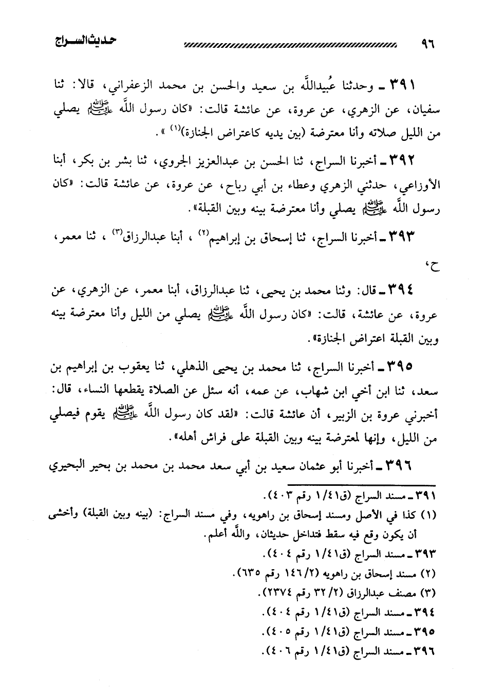 392- أخبرنا السراج، ثنا الحسن بن عبد العزيز الجروي، ثنا بشر بن بكر، أبنا الأَوْزَاعِيُّ، حَدَّثَنِي الزُّهْرِيُّ وَعَطَاءُ بْنُ أَبِي رَبَاحٍ، عَنْ عُرْوَةَ، عَنْ عَائِشَةَ قَالَتْ: ((كَانَ رَسُولُ الله صلى الله عليه وسلم يصلي وأنا معترضة بينه وبين القبلة)) .