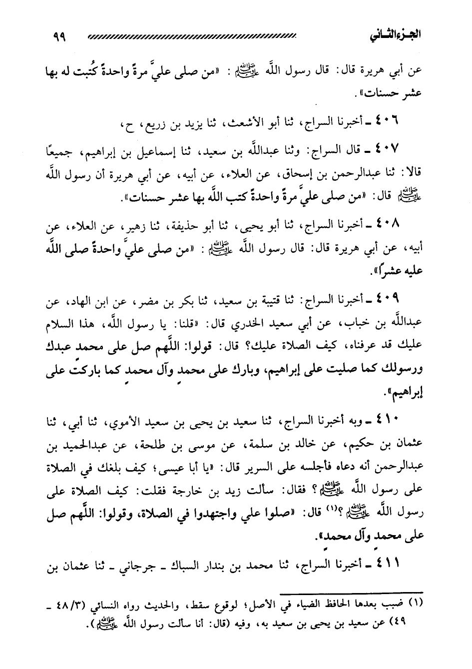 409- أخبرنا السراج: ثنا قتيبة بن سعيد، ثنا بَكْرُ بْنُ مُضَرَ، عَنِ ابْنِ الْهَادِ، عَنْ عَبْدِ اللَّهِ بْنِ خَبَّابٍ، عَنْ أَبِي سَعِيدٍ الْخُدْرِيِّ قَالَ: ((قُلْنَا: يَا رَسُولَ اللَّهِ، هَذَا السَّلامُ عَلَيْكَ قَدْ عَرَفْنَاهُ، كَيْفَ الصَّلاةُ عَلَيْكَ؟ قَالَ: قُولُوا: اللَّهُمَّ صَلِّ عَلَى مُحَمَّدٍ عَبْدِكَ وَرَسُولِكَ كَمَا صَلَّيْتَ عَلَى إِبْرَاهِيمَ، وَبَارِكْ عَلَى محمدٍ وَآلِ محمدٍ كَمَا بَارَكْتَ عَلَى إِبْرَاهِيمَ)) .