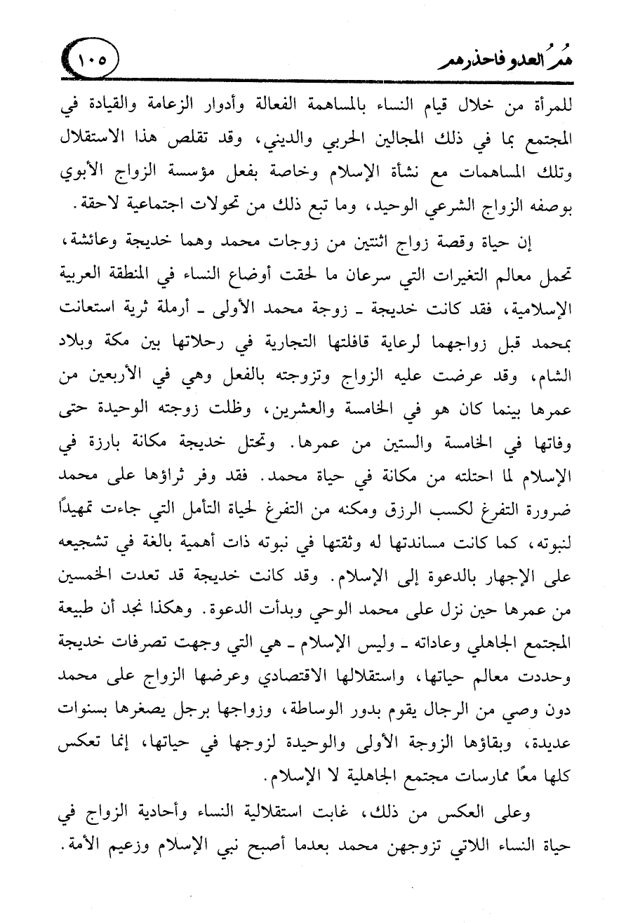 إن حياة وقصة زواج اثنتين من زوجات محمد وهما خديجة وعائشة، تحمل معالم التغيرات التي سرعان ما لحقت أوضاع النساء في المنطقة العربية الإسلامية، فقد كانت خديجة -زوجة محمد الأولى- أرملة ثرية استعانت بمحمد قبل زواجهما لرعاية قافلتها التجارية في رحلاتها بين مكة وبلاد الشام، وقد عرضت عليه الزواج وتزوجته بالفعل وهي في الأربعين من عمرها بينما كان هو في الخامسة والعشرين، وظلت زوجته الوحيدة حتى وفاتها في الخامسة والستين من عمرها. وتحتل خديجة مكانة بارزة في الإسلام لما احتلته من مكانة في حياة محمد. فقد وفر ثراؤها على محمد ضرورة التفرغ لكسب الرزق ومكنه من التفرغ لحياة التأمل التي جاءت تمهيدًا لنبوته، كما كانت مساندتها له وثقتها في نبوته ذات أهمية بالغة في تشجيعه على الإجهار بالدعوة إلى الإسلام. وقد كانت خديجة قد تعدت الخمسين من عمرها حين نزل على محمد الوحي وبدأت الدعوة. وهكذا نجد أن طبيعة المجتمع الجاهلي وعاداته -وليس الإسلام- هي التي وجهت تصرفات خديجة وحددت معالم حياتها، واستقلالها الاقتصادي وعرضها الزواج على محمد دون وصي من الرجال يقوم بدور الوساطة، وزواجها برجل يصغرها بسنوات عديدة، وبقاؤها الزوجة الأولى والوحيدة لزوجها في حياتها، إنما تعكس كلها معًا ممارسات مجتمع الجاهلية لا الإسلام.