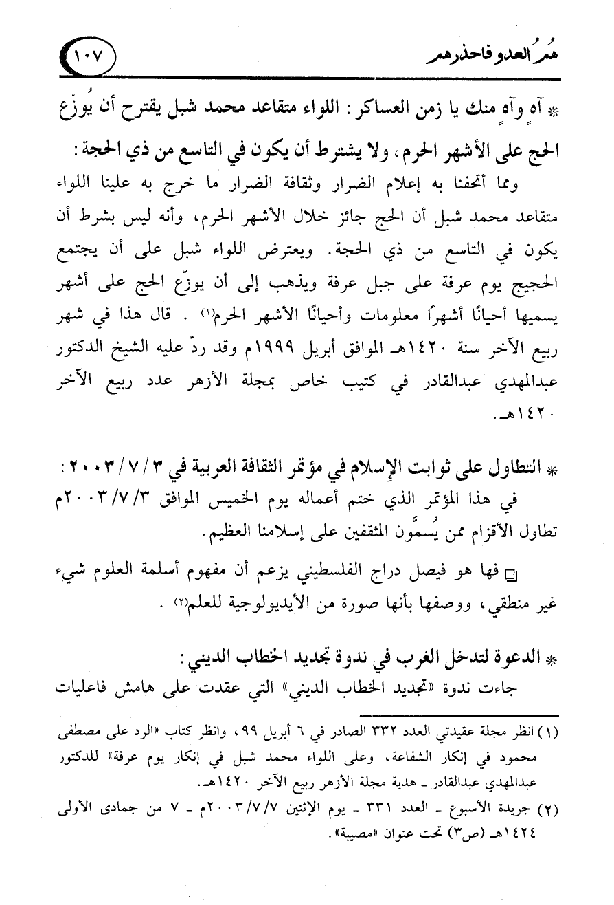 ومما أتحفنا به إعلام الضرار وثقافة الضرار ما خرج به علينا اللواء متقاعد محمد شبل أن الحج جائز خلال الأشهر الحرم، وأنه ليس بشرط أن يكون في التاسع من ذي الحجة. ويعترض اللواء شبل على أن يجتمع الحجيج يوم عرفة على جبل عرفة ويذهب إلى أن يوزّع الحج على أشهر يسميها أحيانًا أشهرًا معلومات وأحيانًا الأشهر الحرم (1). قال هذا في شهر ربيع الآخر سنة 1420 هـ الموافق أبريل 1999 م وقد ردّ عليه الشيخ الدكتور عبد المهدي عبد القادر في كتيب خاص بمجلة الأزهر عدد ربيع الآخر 1420 هـ.