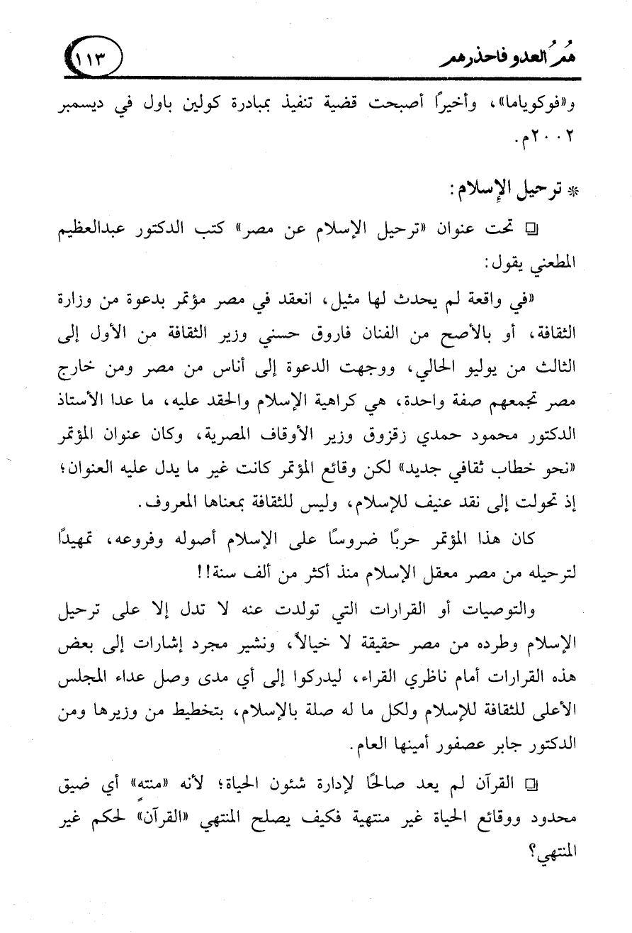- تحت عنوان "ترحيل الإسلام عن مصر" كتب الدكتور عبد العظيم المطعني يقول: