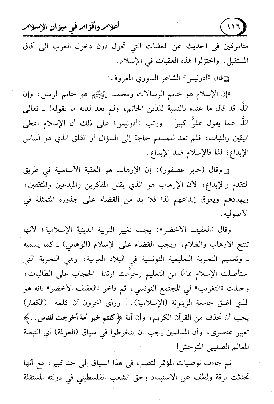 وقال "العفيف الأخضر": يجب تغيير التربية الدينية الإسلامية؛ لأنها تنتج الإرهاب والظلام، ويجب القضاء على الإسلام (الوهابي) -كما يسميه- وتعميم التجربة التعليمية التونسية في البلاد العربية، وهي التجربة التي استأصلت الإسلام تمامًا من التعليم وحرَّمت ارتداء الحجاب على الطالبات، وحبذت "التغريب" في المجتمع التونسي، ثم فاخر "العفيف الأخضر" بأنه هو الذي أغلق جامعة الزيتونة (الإسلامية) .. ورأى آخرون أن كلمة (الكفار) يحب أن تحذف من القرآن الكريم، وأن آية {كُنْتُمْ خَيْرَ أُمَّةٍ أُخْرِجَتْ لِلنَّاسِ ... } تعبير عنصري، وأن المسلمين يجب أن ينخرطوا في سياق (العولمة) أي التبعية للعالم الصليبي المتوحش!