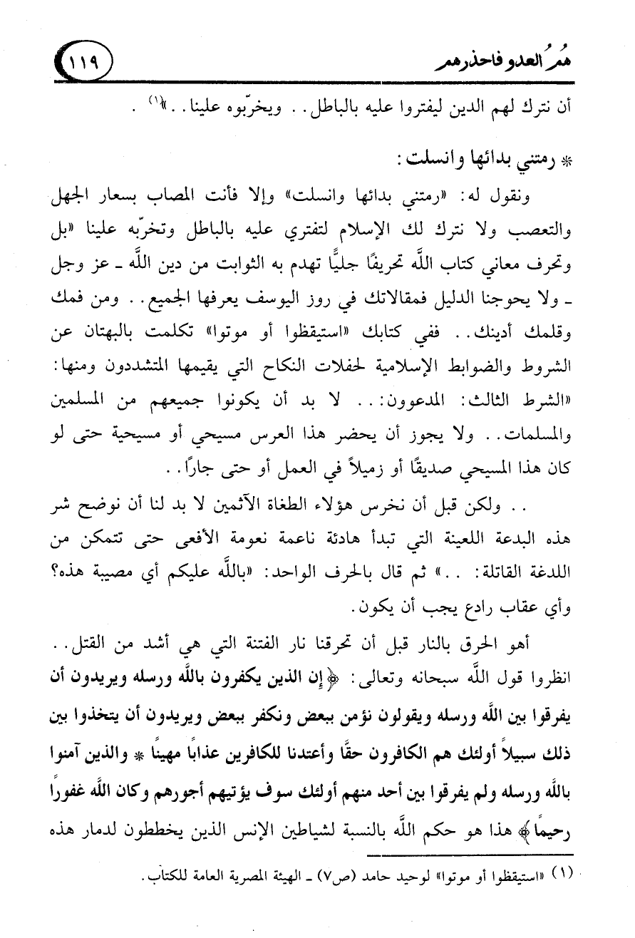 ونقول له: "رمتني بدائها وانسلت" وإلا فأنت المصاب بسعار الجهل والتعصب ولا نترك لك الإسلام لتفتري عليه بالباطل وتخرّبه علينا "بل وتحرف معاني كتاب الله تحريفًا جليًّا تهدم به الثوابت من دين الله -عز وجل - ولا يحوجنا الدليل فمقالاتك في روزاليوسف يعرفها الجميع .. ومن فمك وقلمك أدينك .. ففي كتابك "استيقظوا أو موتوا" تكلمت بالبهتان عن الشروط والضوابط الإسلامية لحفلات النكاح التي يقيمها المتشددون ومنها: