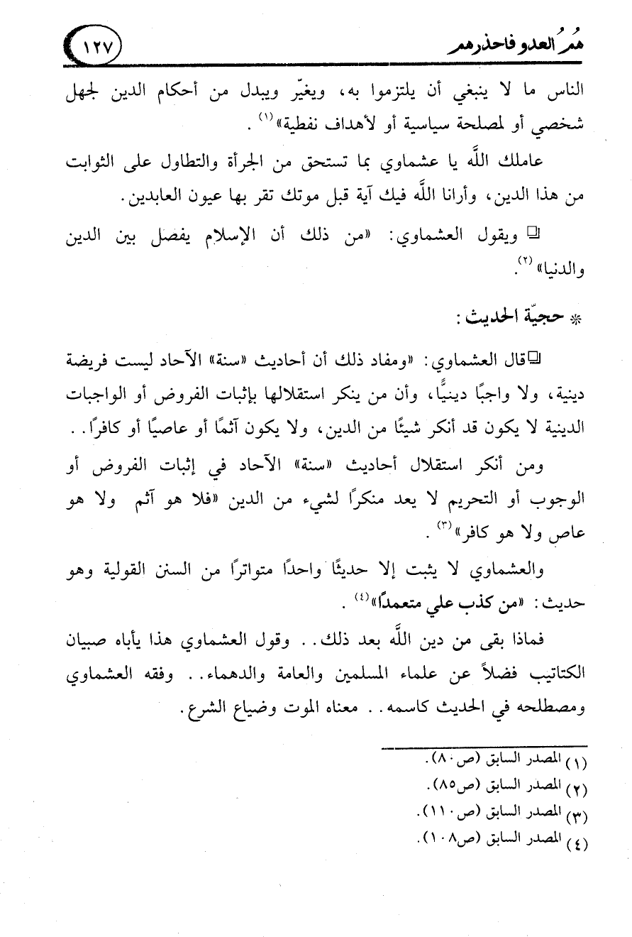 فماذا بقى من دين الله بعد ذلك .. وقول العشماوي هذا يأباه صبيان الكتاتيب فضلاً عن علماء المسلمين والعامة والدهماء .. وفقه العشماوي ومصطلحه في الحديث كاسمه .. معناه الموت وضياع الشرع.