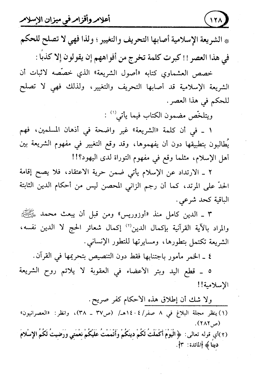 * الشريعة الإِسلامية أصابها التحريف والتغيير؛ ولذا فهي لا تصلح للحكم في هذا العصر!! كبرت كلمة تخرج من أفواههم إِن يقولون إِلا كذبًا: